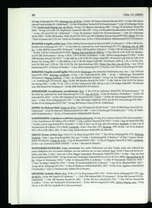 BERGFINK Fringilla montifringilla: Während des Heimzuges sehr schwaches Vorkommen, max. Ans.: 7.Apr 250 Forst Sauen/LOS(HH). Heimzug, Letztbeob.: 25.Apr 2 bei Drahendorf/LOS(HH)* 26.Apr 1 Falkenberger Rieselfeld/B (B.Schonert). Wegzug, Erstbeob.: 17.Sep 1 dz. Schorfheide/BAR(R.Flath)* 18.Sep 5 dz. bei Sallgast/OSL (ERaden) und 1 dz. Teufelsberg/B(W.Schreck). Max.: 10.Okt 500 Randow-Bruch/UM(WD)* 11.Okt 1940 dz. 9.00-10.30 Uhr Rietzer See-Streng(HH )* 12.Okt 775 dz. 7.10-11.10 Uhr Lützlow/UM(BR ), 584 dz. 6.50-15.30 Stolper Feld/OHV (W.Schreck) und 1000 Brück/PM(P.Schubert)* 20.Okt 4000 Nichel/PM(P.Schubert).