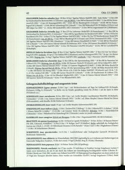GRAUAMMER Emberiza calandra: Brut: 158 Rev./18 km? Tagebau Welzow-Süd/SPN (RB)- hohe Dichte* 12 Rev./200 ha Deichvorland bei Reitwein/MOL (U.Schroeter). Ans. ab 200 Ex.: 3.Jan 500 bei Bornow/LOS(HH)* 11.Jan 450 bei Stremmen/LOS(HH)* 12.Jan 410 Beauregard/MOL(SF)* 8.Feb 200 bei Blumberg/UM (U.Kraatz)* 10.Feb 300 bei Frauenhagen/UM(J.Mundt)* 13.Feb 200 bei Schöneberg/UM (J.Mundt)* 7.Dez 500 Woltersdorf/UM (W.Mädlow, H.Elvers) und 300 Gülper See(HH )* 12.-18.Dez 500 Gieshof/MOL(ME, U.Schroeter)* 23.Dez 300 bei Angermünde/UM (J.Bellebaum).