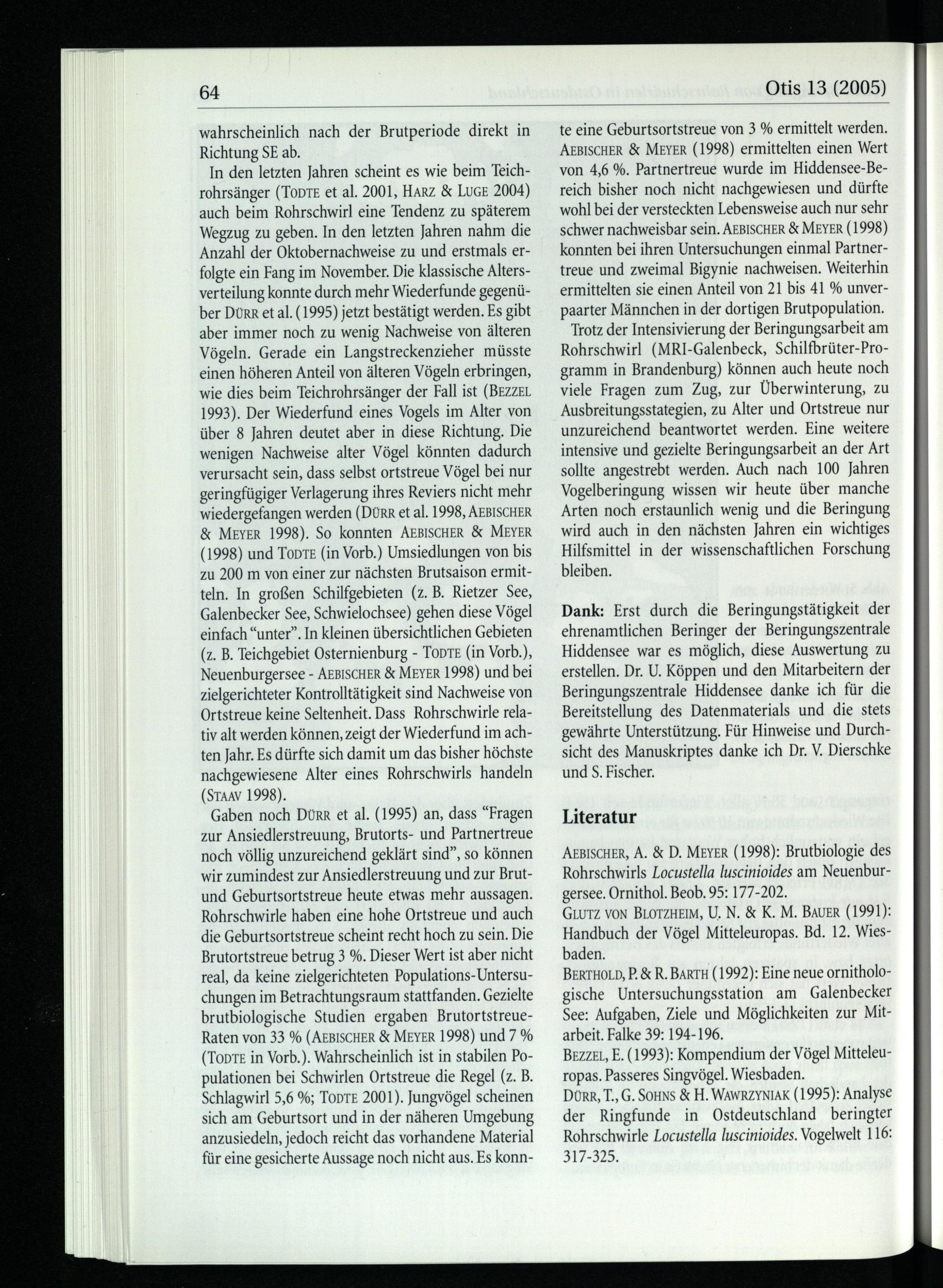 Dank: Erst durch die Beringungstätigkeit der ehrenamtlichen Beringer der Beringungszentrale Hiddensee war es möglich, diese Auswertung zu erstellen. Dr. U. Köppen und den Mitarbeitern der Beringungszentrale Hiddensee danke ich für die Bereitstellung des Datenmaterials und die stets gewährte Unterstützung. Für Hinweise und Durchsicht des Manuskriptes danke ich Dr. V. Dierschke und S. Fischer .