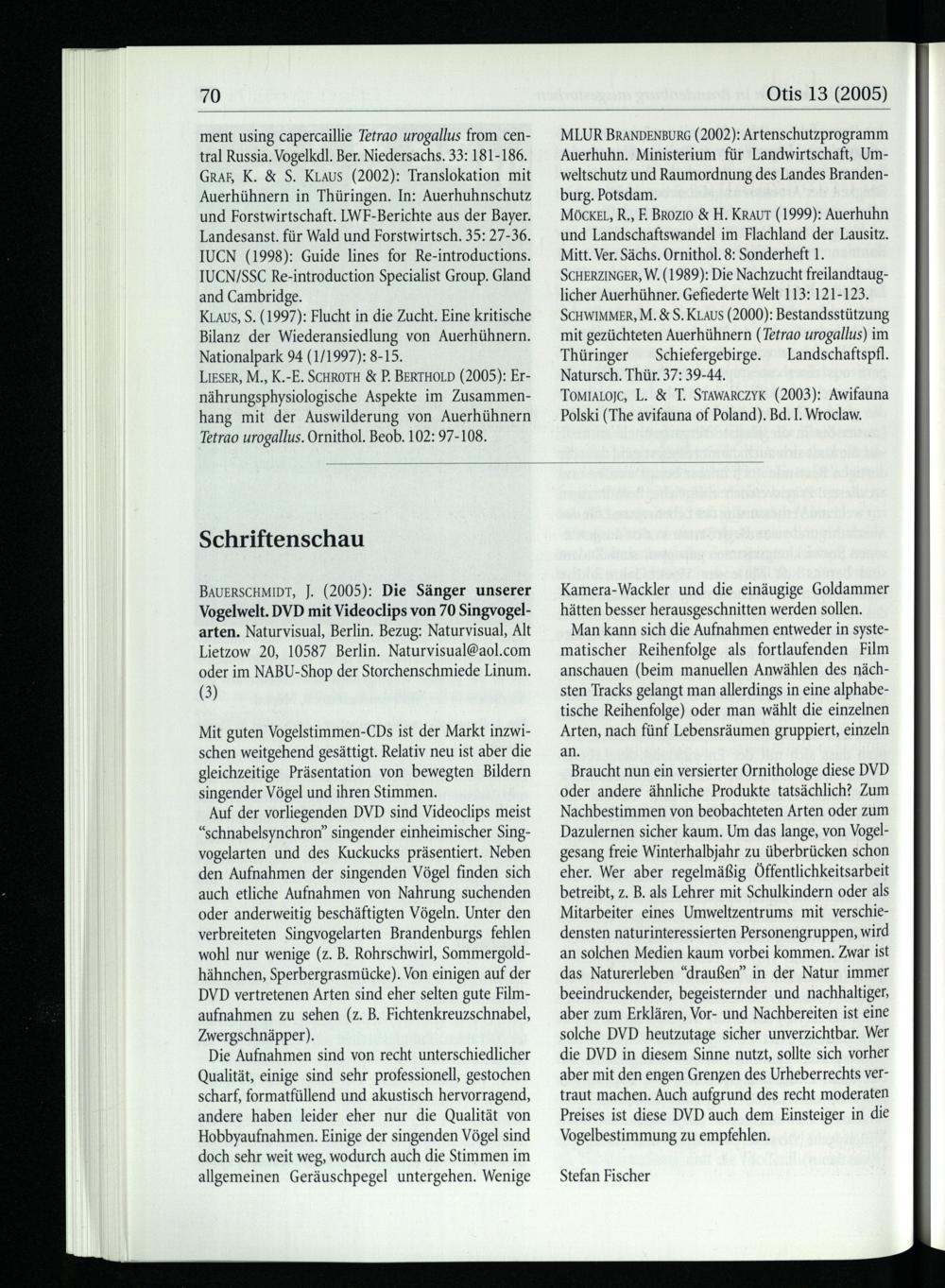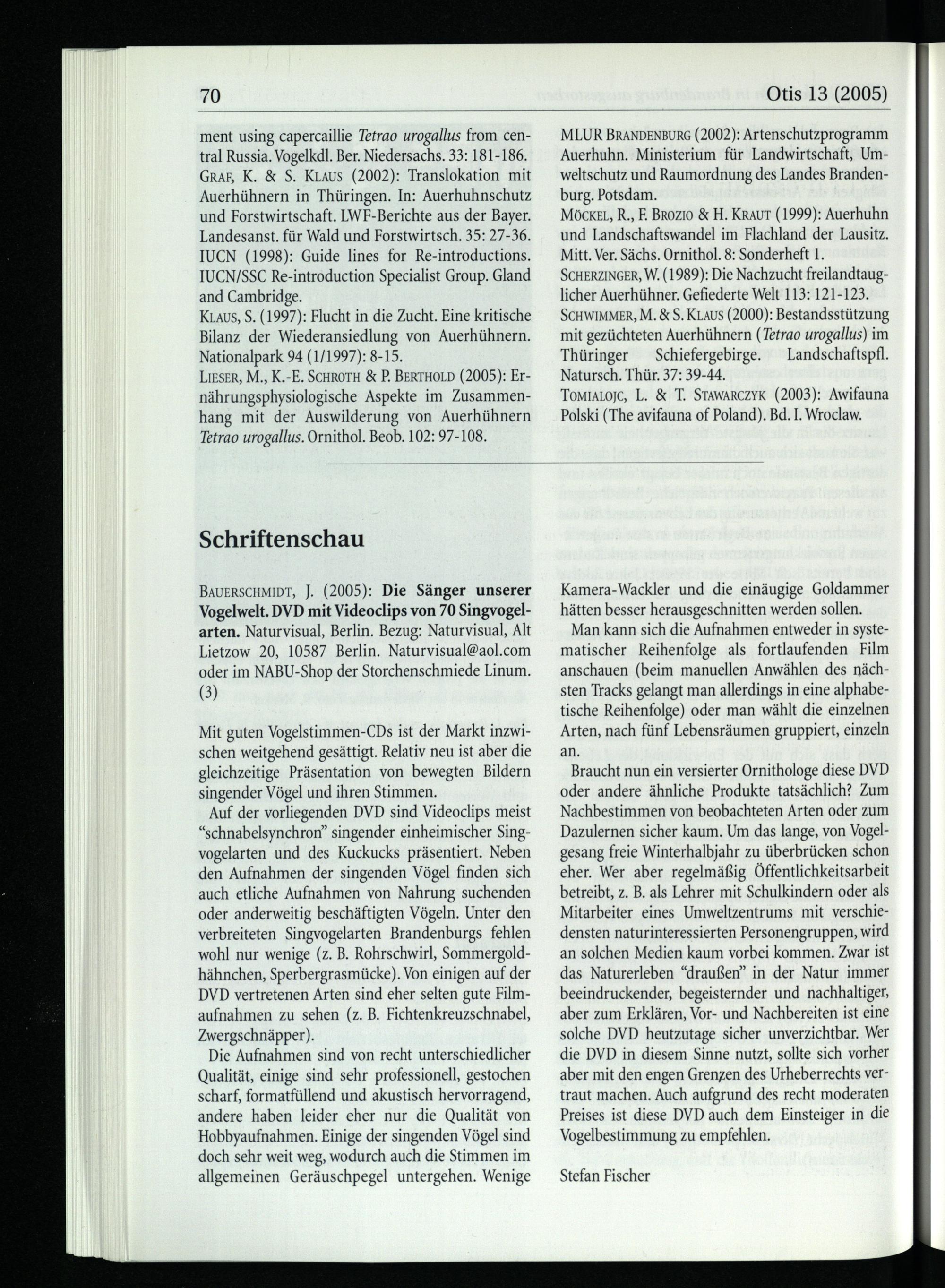 BAUERSCHMIDT, J.(2005): Die Sänger unserer Vogelwelt. DVD mit Videoclips von 70 Singvogelarten. Naturvisual, Berlin . Bezug: Naturvisual, Alt Lietzow 20, 10587 Berlin . Naturvisual@aol.com oder im NABU-Shop der Storchenschmiede Linum.