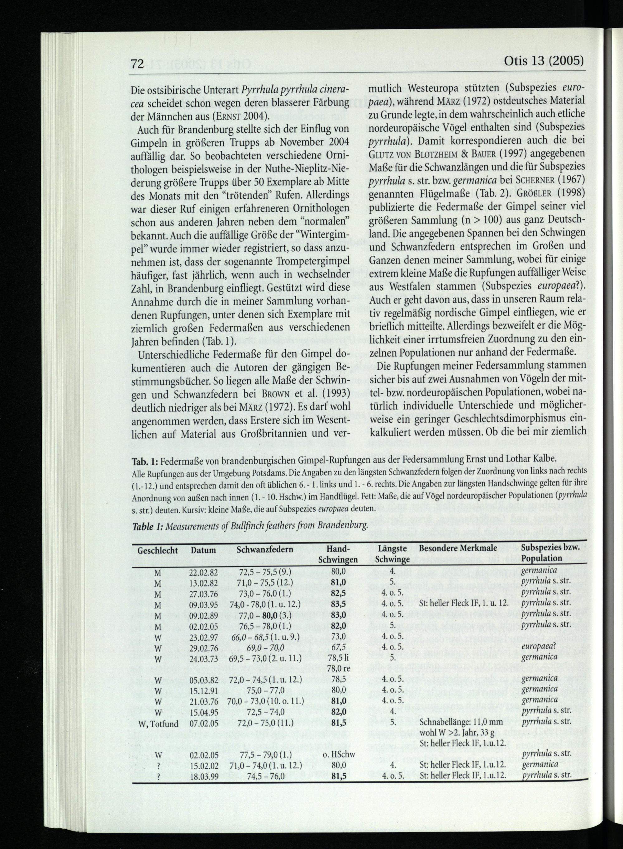 Auch für Brandenburg stellte sich der Einflug von Gimpeln in größeren Trupps ab November 2004 auffällig dar. So beobachteten verschiedene Ornithologen beispielsweise in der Nuthe -Nieplitz-Niederung größere Trupps über 50 Exemplare ab Mitte des Monats mit den“trötenden” Rufen. Allerdings war dieser Ruf einigen erfahreneren Ornithologen schon aus anderen Jahren neben dem“normalen” bekannt. Auch die auffällige Größe der“Wintergimpel” wurde immer wieder registriert, SO dass anzunehmen ist, dass der sogenannte Trompetergimpel häufiger, fast jährlich, wenn auch in wechselnder Zahl, in Brandenburg einfliegt. Gestützt wird diese Annahme durch die in meiner Sammlung vorhandenen Rupfungen, unter denen sich Exemplare mit ziemlich großen Federmaßen aus verschiedenen Jahren befinden(Tab. 1).