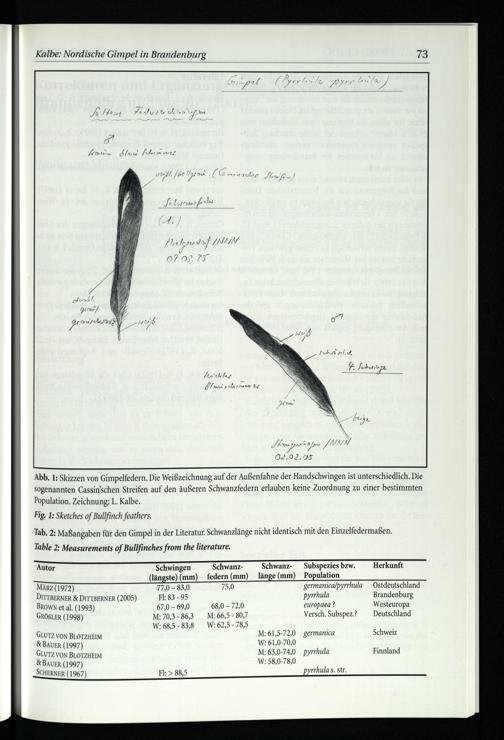 Population. Zeichnung: L. Kalbe. Fig, 1: Sketches of Bullfinch feathers. Tab. 2: Maßangaben für den Gimpel in der Literatur. Schwanzlänge nicht identisch mit den Einzelfedermaßen.