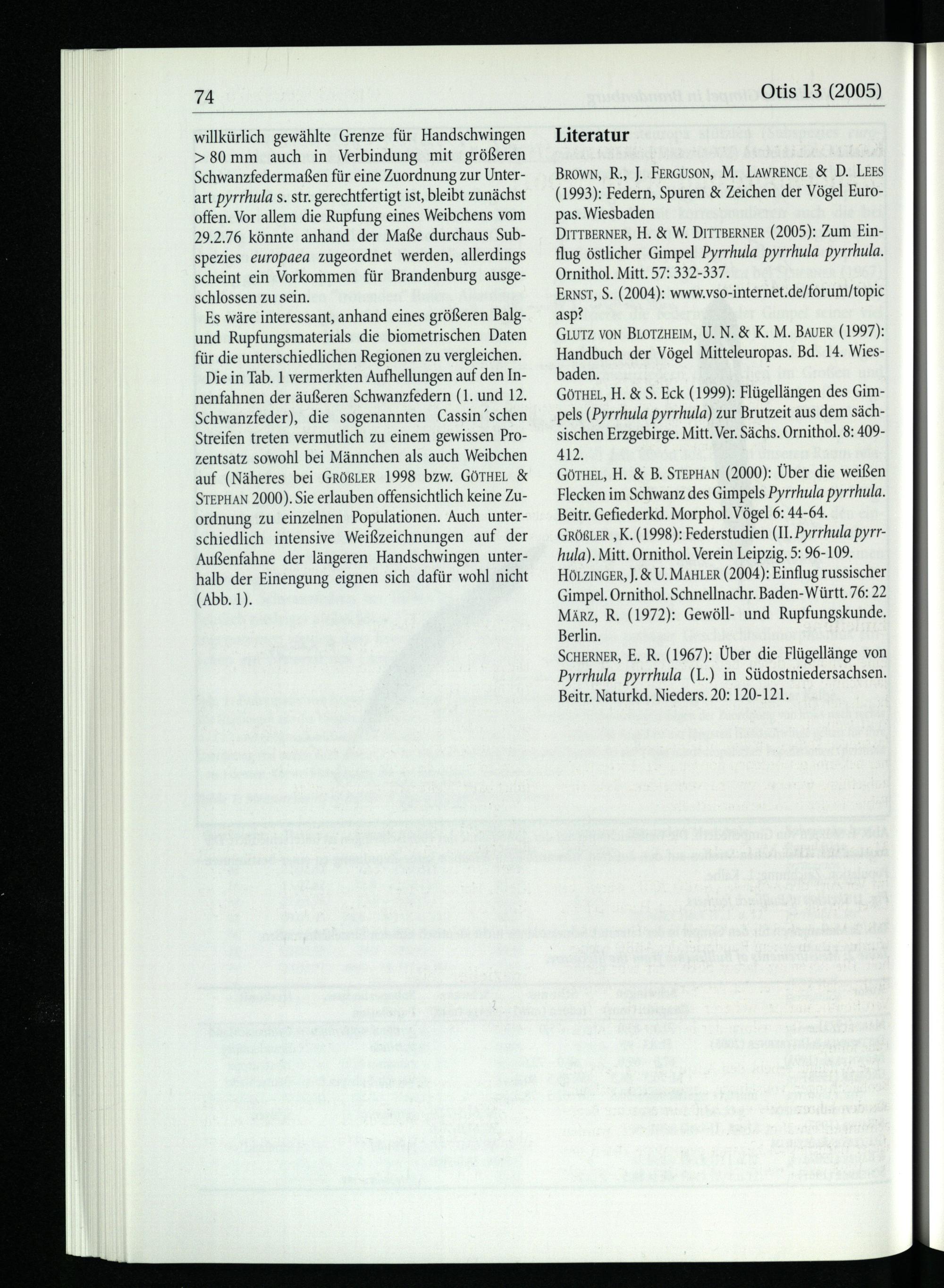 GöTHEL, H.& S. Eck(1999): Flügellängen des Gimpels(Pyrrhula pyrrhula ) zur Brutzeit aus dem sächsischen Erzgebirge . Mitt. Ver. Sächs. Ornithol. 8: 409412.