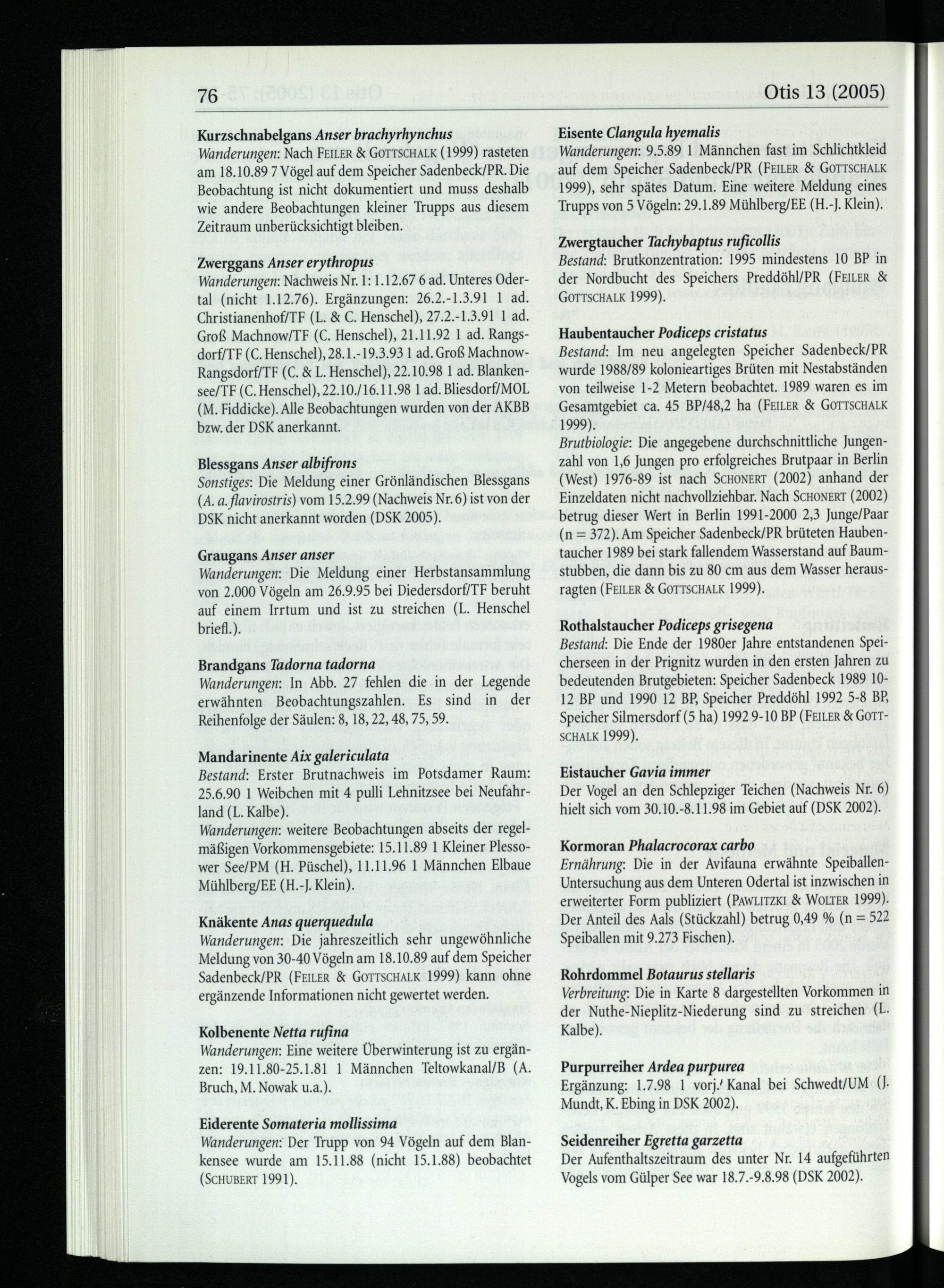 Wanderungen: Nachweis Nr. 1: 1.12.67 6 ad. Unteres Oder tal (nicht 1.12.76). Ergänzungen: 26.2.-1.3.91 1 ad. Christianenhof/TF(L.& C. Henschel), 27.2.-1.3.91 1 ad. Groß Machnow/TF(C. Henschel), 21.11.92 1 ad. Rangs dorf/TF (C. Henschel), 28.1.-19.3.93 1 ad. Groß MachnowRangsdorf/TF(C.& L. Henschel), 22.10.98 1 ad. Blanken see/TF (C. Henschel), 22.10./16.11.98 1 ad. Bliesdorf/MOL (M. Fiddicke). Alle Beobachtungen wurden von der AKBB bzw. der DSK anerkannt.