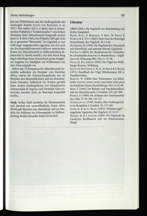 MäDLow, W.(2004): Zum Vorkommen von Nebelkrähe(Corvus corone cornix) und Elster(Pica pica) im ländlichen Raum Brandenburgs . Otis 12: 81-88. Mess, T.(1964): Zur Biologie und Populationsdynamik des Mäusebussards. J. Ornithol. 105: 247-306. PIESKER, O0.(1980): Die Avifauna des Unterspreewaldes. Falke 27: 94-100, 132-137.