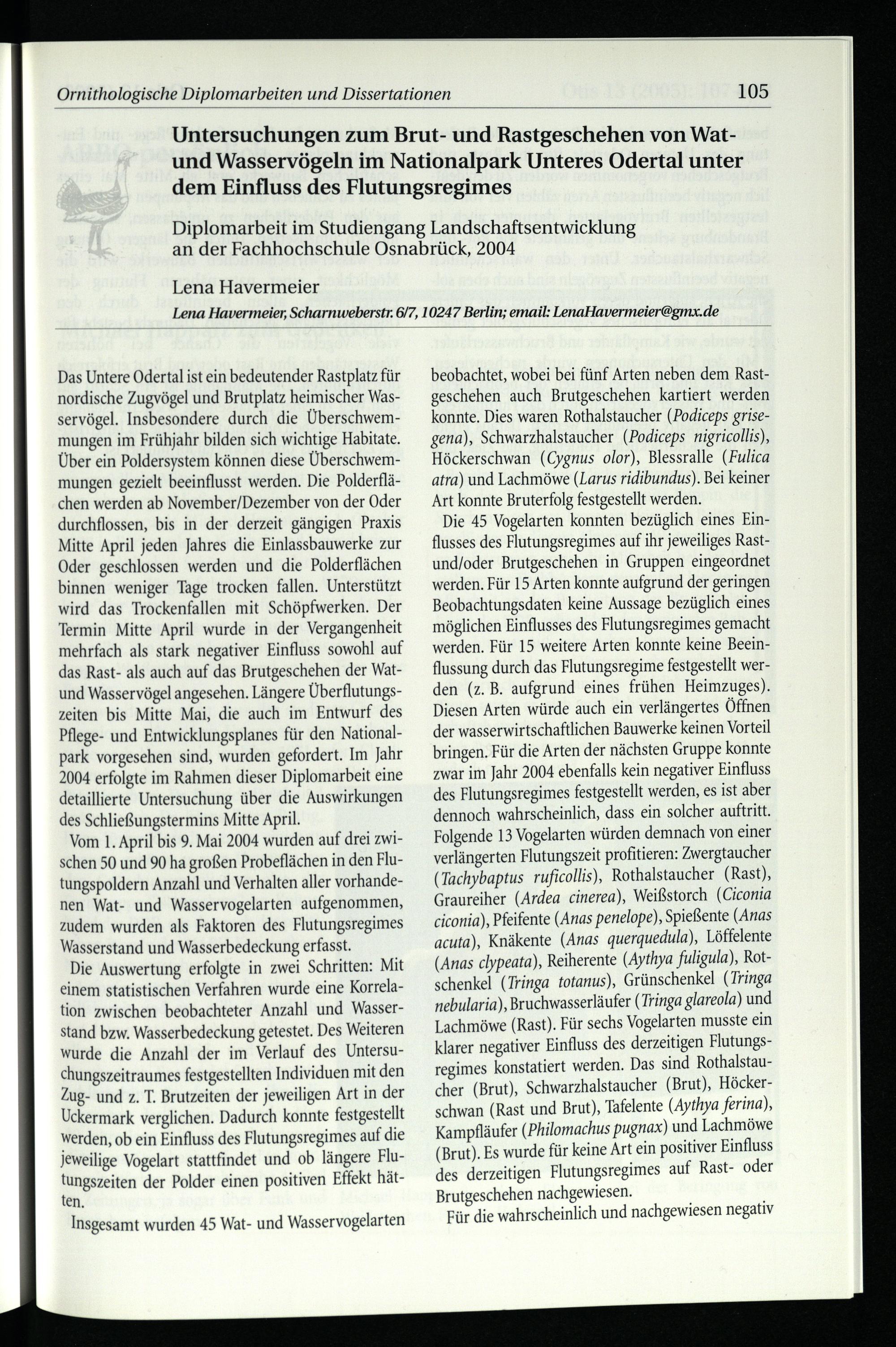 Das Untere Odertal ist ein bedeutender Rastplatz für nordische Zugvögel und Brutplatz heimischer Wasservögel. Insbesondere durch die Überschwemmungen im Frühjahr bilden sich wichtige Habitate. Über ein Poldersystem können diese Überschwemmungen gezielt beeinflusst werden. Die Polderflächen werden ab November/Dezember von der Oder durchflossen, bis in der derzeit gängigen Praxis Mitte April jeden Jahres die Einlassbauwerke zur Oder geschlossen werden und die Polderflächen binnen weniger Tage trocken fallen. Unterstützt wird das Trockenfallen mit Schöpfwerken. Der Termin Mitte April wurde in der Vergangenheit mehrfach als stark negativer Einfluss sowohl auf das Rast- als auch auf das Brutgeschehen der Watund Wasservögel angesehen. Längere Überflutungszeiten bis Mitte Mai, die auch im Entwurf des Pflege- und Entwicklungsplanes für den Nationalpark vorgesehen sind, wurden gefordert. Im Jahr 2004 erfolgte im Rahmen dieser Diplomarbeit eine detaillierte Untersuchung über die Auswirkungen des Schließungstermins Mitte April.