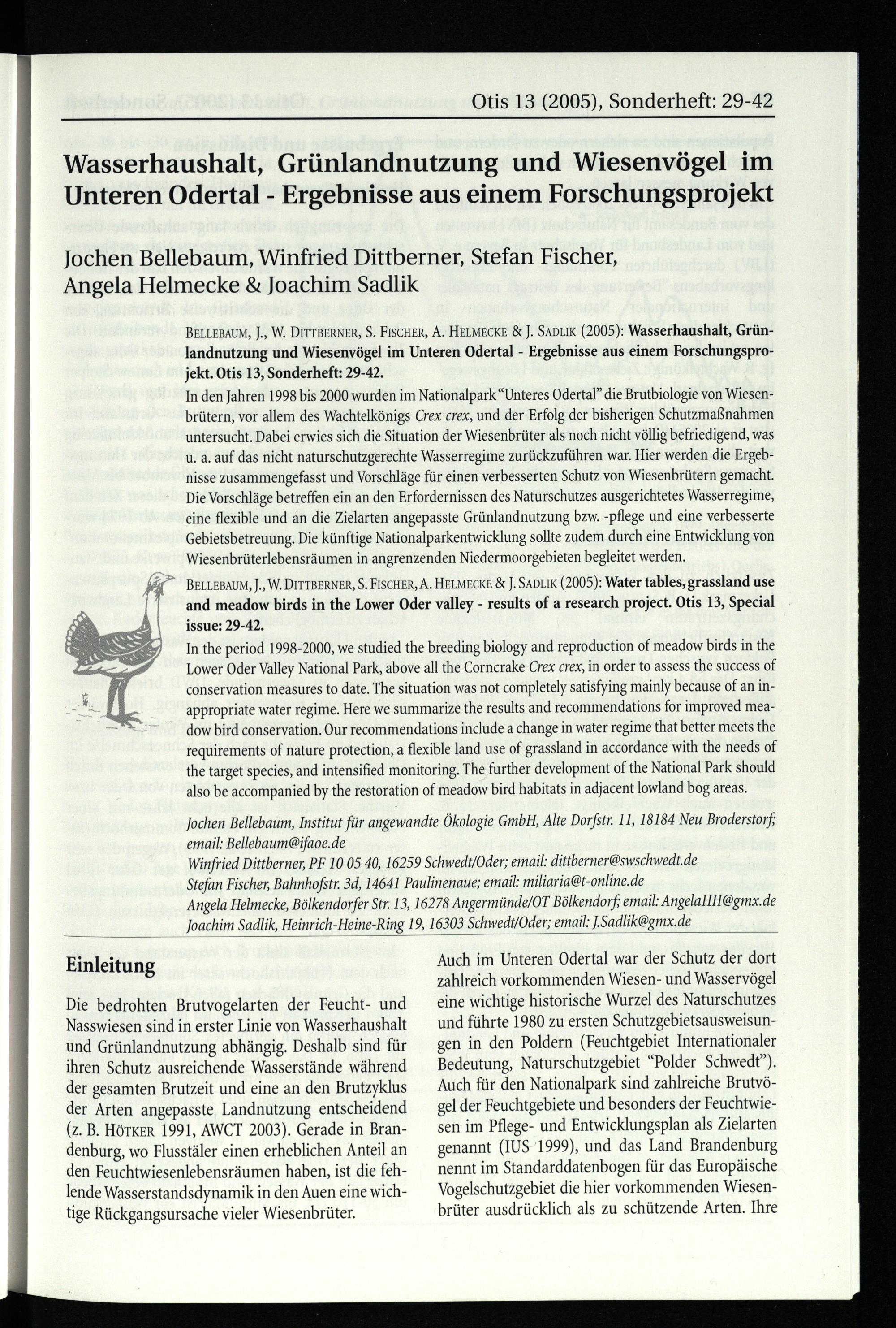BELLEBAUM, J., W. DITTBERNER, S. FISCHER , A. HELMECKE& J. SADLIK(2005): Wasserhaushalt, Grünlandnutzung und Wiesenvögel im Unteren Odertal - Ergebnisse aus einem Forschungsprojekt. Otis 13, Sonderheft: 29-42.