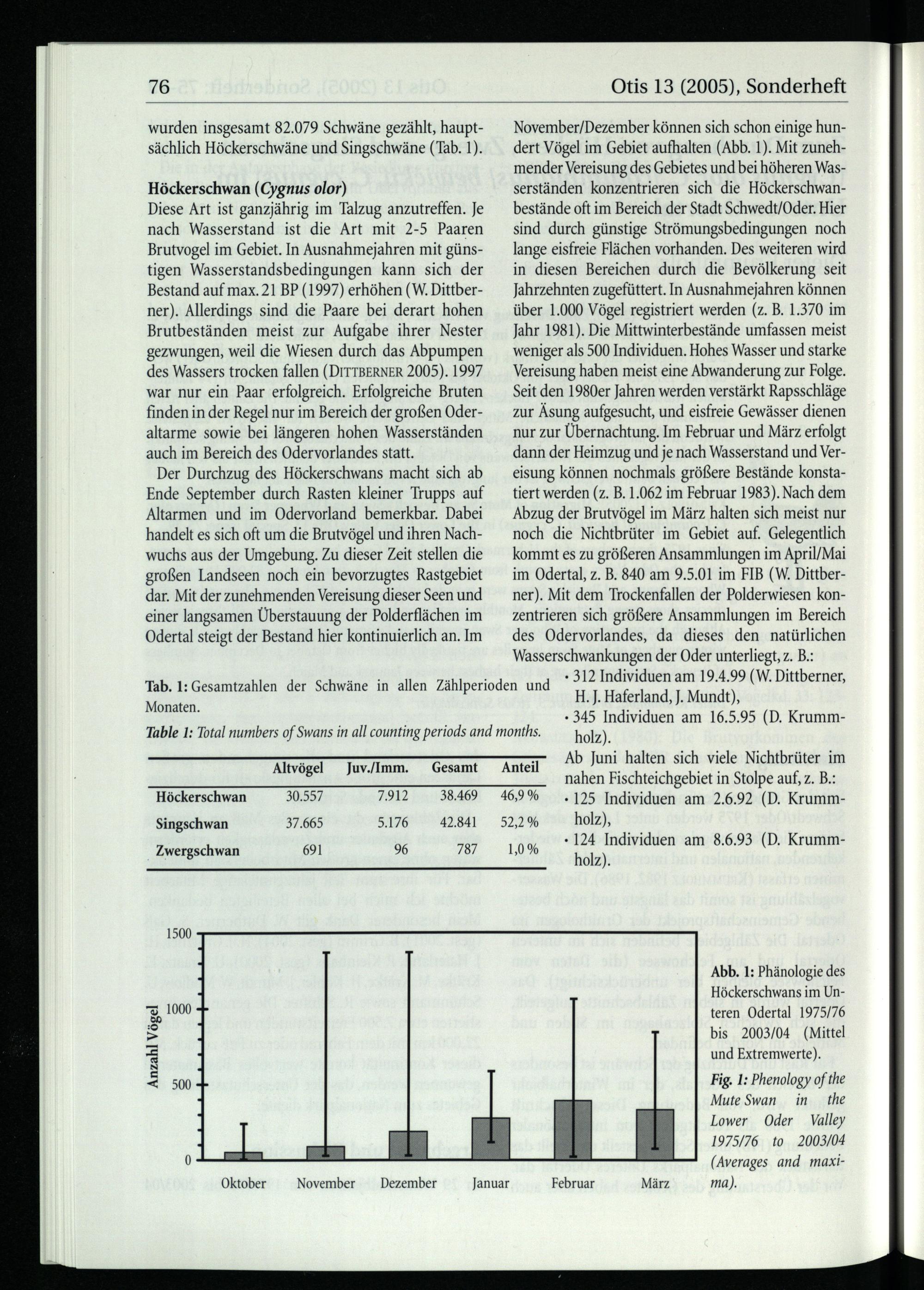 November/Dezember können sich schon einige hundert Vögel im Gebiet aufhalten(Abb. 1). Mit zunehmender Vereisung des Gebietes und bei höheren Wasserständen konzentrieren sich die Höckerschwanbestände oft im Bereich der Stadt Schwedt/Oder . Hier sind durch günstige Strömungsbedingungen noch lange eisfreie Flächen vorhanden. Des weiteren wird in diesen Bereichen durch die Bevölkerung seit Jahrzehnten zugefüttert. In Ausnahmejahren können über 1.000 Vögel registriert werden(z. B. 1.370 im Jahr 1981). Die Mittwinterbestände umfassen meist weniger als 500 Individuen. Hohes Wasser und starke Vereisung haben meist eine Abwanderung zur Folge. Seit den 1980er Jahren werden verstärkt Rapsschläge zur Äsung aufgesucht, und eisfreie Gewässer dienen nur zur Übernachtung. Im Februar und März erfolgt dann der Heimzug und je nach Wasserstand und Vereisung können nochmals größere Bestände konstatiert werden(z. B. 1.062 im Februar 1983). Nach dem Abzug der Brutvögel im März halten sich meist nur noch die Nichtbrüter im Gebiet auf. Gelegentlich kommt es zu größeren Ansammlungen im April/Mai im Odertal, z. B. 840 am 9.5.01 im FIB(W. Dittberner). Mit dem Trockenfallen der Polderwiesen konzentrieren sich größere Ansammlungen im Bereich des Odervorlandes, da dieses den natürlichen Wasserschwankungen der Oder unterliegt, z. B.: - 312 Individuen am 19.4.99(W. Dittberner, H. J. Haferland, J. Mundt), - 345 Individuen am 16.5.95(D. Krummholz). Ab Juni halten sich viele Nichtbrüter im nahen Fischteichgebiet in Stolpe auf, z. B.: 125 Individuen am 2.6.92(D. Krummholz), 124 Individuen am 8.6.93(D. Krummholz).