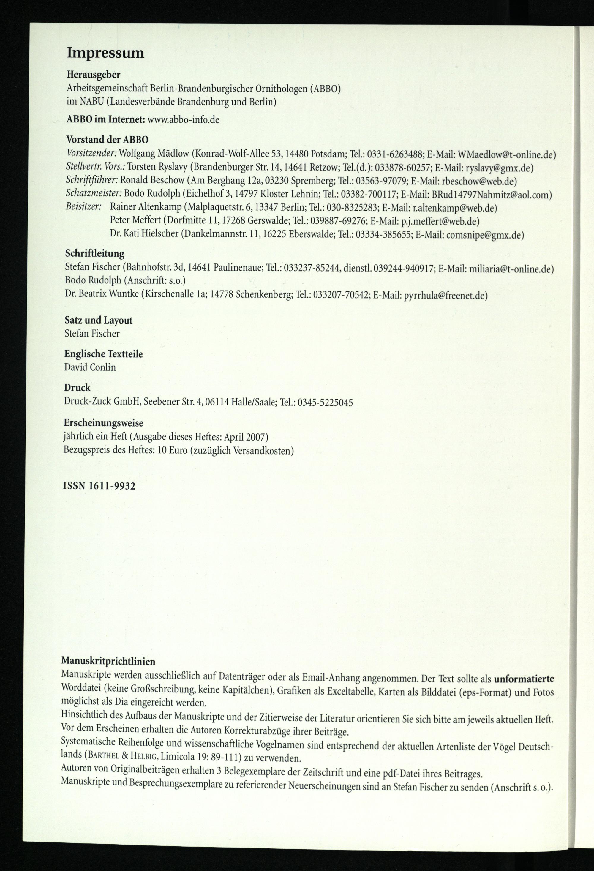 Stefan Fischer(Bahnhofstr. 3d, 14641 Paulinenaue ; Tel.: 033237-85244, dienstl. 039244-940917; E-Mail: miliaria@t-online.de) Bodo Rudolph(Anschrift: s.0.)