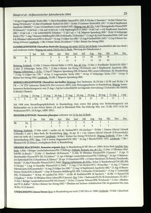 : Brut: In Brandenburg 83 BP(RysLAvY 2006). Keine Beob. Jan/Feb. Erstbeob.: 4.Mär 1 Belziger Landschaftswiesen/PM(T.Hellwig). Frühjahr, Brutzeit, Ans. ab 5 Ex.: 23.Mär 15 Elbtalaue Mödlich/PR(A.Bruch)* 25.Mär 11 Havelnied.(H.Pretzsch)* 31.Mär 50 Elbtalaue Hinzdorf/PR(S.Jansen)* 13.Apr 15 Jänschwalder Wiesen/SPN (RZ, B.Litzkow)* 21.Apr 6 Belziger Landschaftswiesen/PM(T.Hellwig)* 26.Apr 15 Bahnwiesen Siefertshof/UM(S.Hundrieser, K.Eilmes)* 28.Apr 15 Dossenied./OPR+ 6 Untere Havelnied.(H.Pretsch, Drozdowski, Sawall)* 23.Mai 9 Neuzeller Wiesen/LOS(C.Pohl). Wegzug, Gebietsmax. ab 10 Ex.: 26.Jun 21 Randowbruch/UM( BR, HH, N.Vilcsko)* 3.Aug 14 Neuzeller Wiesen/LOS(C.Pohl)* 13.Aug 12 bei Buckow/HVL (W.Jaschke)* 14.Aug 17 Unteres Odertal Gartz(D.Krummholz)* 14.Aug 25 Gülper See( BR)* 22.Aug 14 Nieplitznied. Zauchwitz ( BR)* 23.Aug 10 Biesenbrower Teiche/UM(J.Mundt)* 2.Sep 16 Kiesseen Mühlberg/EE( HH, T.Schneider, H.Michaelis)* 15.Sep 17 Lichterfeld / OSL (T.Schneider)* 30.Sep 34 Landin/UM(WD)* 16.Okt 40 Roddahn/OPR (K.Tauchert)* 26.Okt 13 Kunow/UM (I1.Kaphus)* 10.Nov 29 Elbtalaue Klein Lüben/PR(S.Jansen). Dez: 5.Dez 1 Radensdorf/LDS (H.Deutschmann, TN, RZ)* 15.Dez 1 Belziger Landschaftswiesen/PM(M.Grimm)* 18.Dez 2 Linumer Wiesen/OPR (W.Schreck)* 21.Dez 1 Blankensee/TF(L.Kalbe)* 28.Dez 4 Rietzer See-Streng( HH)* Elbtalaue auf Sachsen-Anhaltischem Ufer im gesamten Dez, max. 28.Dez 16(S.Jansen).