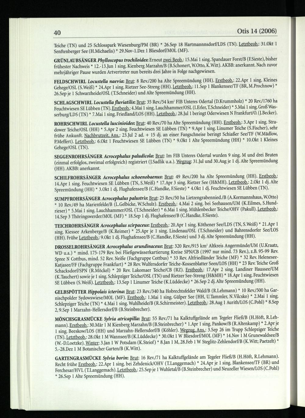 SCHILFROHRSÄNGER Acrocephalus schoenobaenus: Brut: 49 Rev./200 ha Alte Spreemündung(HH ). Erstbeob.: 14.Apr 1 sing. Feuchtwiesen SE Lübben(TN, S.Weiß)* 17.Apr 3 sing. Rietzer See(H&MH). Letztbeob.: 2.Okt 1 dj. Alte Spreemündung(HH )* 3.Okt 1 dj. Flughafensee/B(C.Handke, ESieste)* 4.Okt 1 dj. Feuchtwiesen SE Lübben(TN).