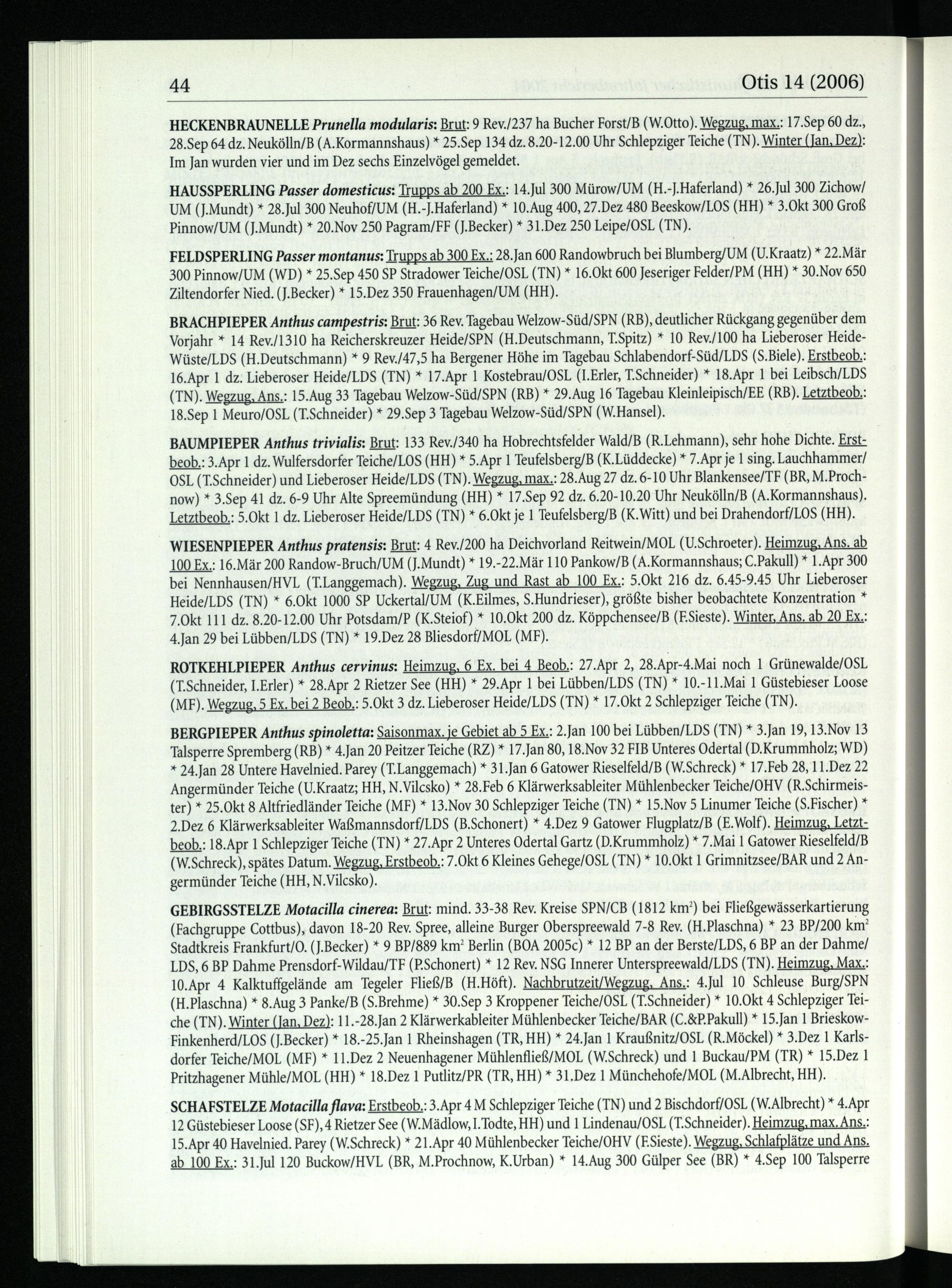 BAUMPIEPER Anthus trivialis: Brut: 133 Rev./340 ha Hobrechtsfelder Wald/B(R.Lehmann), sehr hohe Dichte. Erstbeob.: 3.Apr 1 dz. Wulfersdorfer Teiche/LOS(HH)* 5.Apr 1 Teufelsberg/B(K.Lüddecke)* 7.Apr je 1 sing. Lauchhammer / OSL (T.Schneider) und Lieberoser Heide/LDS (TN). Wegzug, max.: 28.Aug 27 dz. 6-10 Uhr Blankensee/TF (BR , M.Prochnow)* 3.Sep 41 dz. 6-9 Uhr Alte Spreemündung(HH )* 17.Sep 92 dz. 6.20-10.20 Uhr Neukölln/B (A.Kormannshaus). Letztbeob.: 5.Okt 1 dz. Lieberoser Heide/LDS (TN)* 6.Okt je 1 Teufelsberg/B(K.Witt ) und bei Drahendorf/LOS(HH).