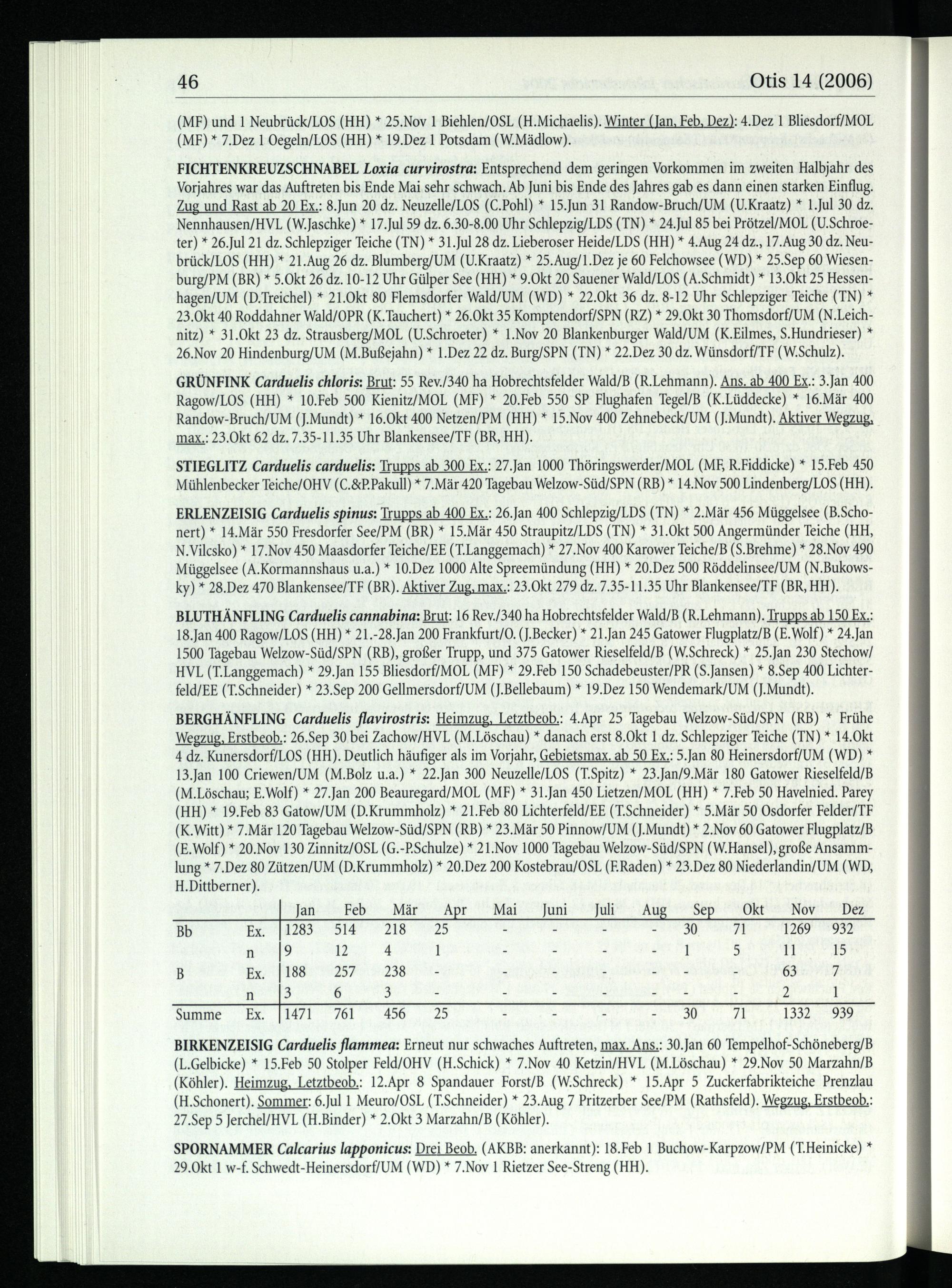 BERGHÄNFLING Carduelis flavirostris: Heimzug, Letztbeob.: 4.Apr 25 Tagebau Welzow-Süd/SPN (RB)* Frühe Wegzug, Erstbeob.: 26.Sep 30 bei Zachow/HVL (M.Löschau)* danach erst 8.Okt 1 dz. Schlepziger Teiche(TN)* 14.Okt 4 dz. Kunersdorf/LOS(HH ). Deutlich häufiger als im Vorjahr, Gebietsmax. ab 50 Ex.: 5.Jan 80 Heinersdorf/UM(WD)* 13.Jan 100 Criewen/UM(M.Bolz u.a.)* 22.Jan 300 Neuzelle/LOS(T.Spitz)* 23.Jan/9.Mär 180 Gatower Rieselfeld/B (M.Löschau; E.Wolf)* 27.Jan 200 Beauregard/MOL(MF)* 31.Jan 450 Lietzen/MOL(HH )* 7.Feb 50 Havelnied. Parey (HH )* 19.Feb 83 Gatow/UM (D.Krummholz)* 21.Feb 80 Lichterfeld/EE(T.Schneider)* 5.Mär 50 Osdorfer Felder/TF (K.Witt )* 7.Mär 120 Tagebau Welzow-Süd/SPN (RB)* 23.Mär 50 Pinnow/UM(J.Mundt)* 2.Nov 60 Gatower Flugplatz/B (E.Wolf)* 20.Nov 130 Zinnitz/OSL (G.-P.Schulze)* 21.Nov 1000 Tagebau Welzow-Süd/SPN (W.Hansel), große Ansamm­lung* 7.Dez 80 Zützen/UM(D.Krummholz)* 20.Dez 200 Kostebrau/OSL (ERaden)* 23.Dez 80 Niederlandin/UM(WD, H.Dittberner).