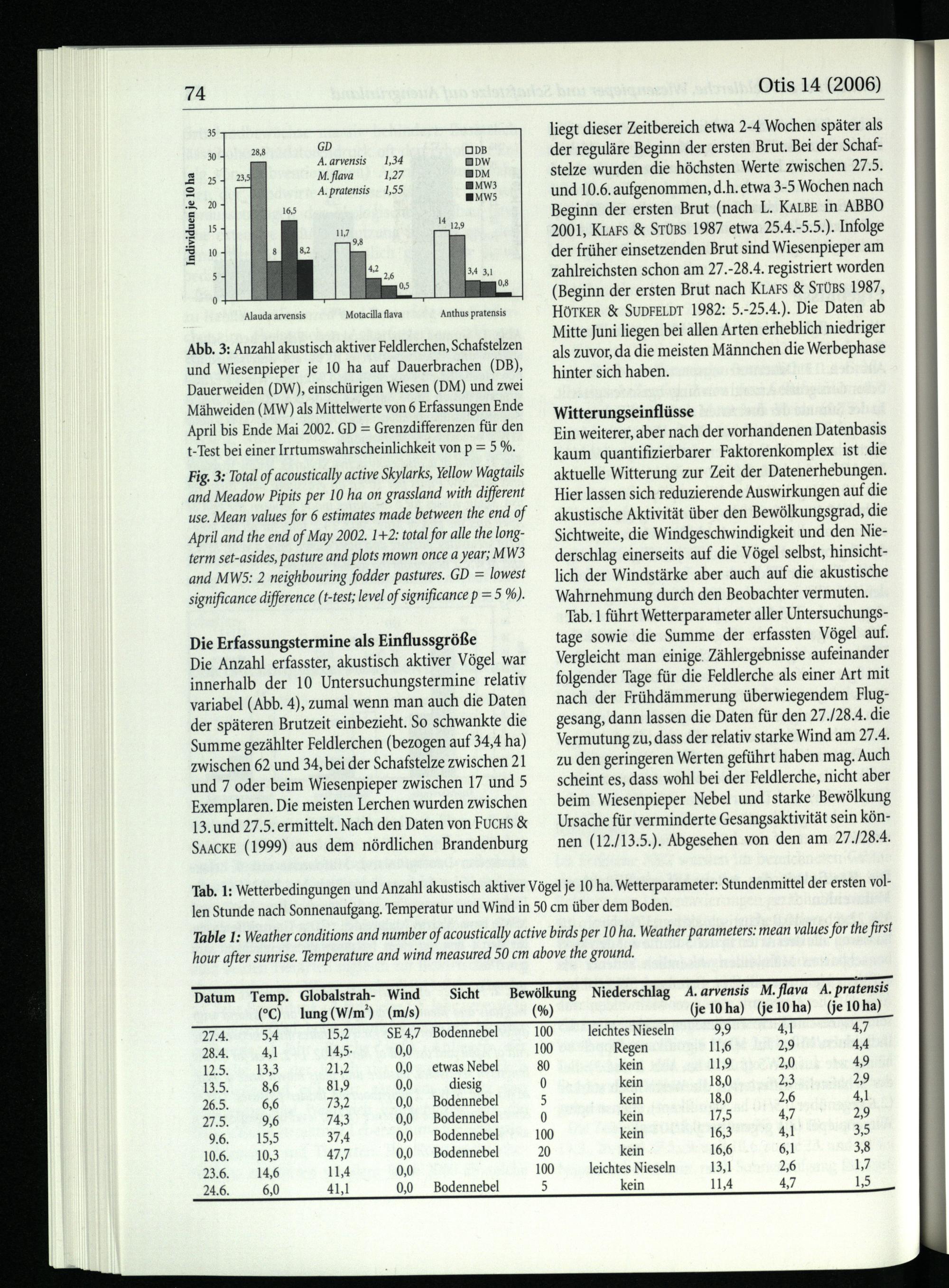 Witterungseinflüsse Ein weiterer, aber nach der vorhandenen Datenbasis kaum quantifizierbarer Faktorenkomplex ist die aktuelle Witterung zur Zeit der Datenerhebungen. Hier lassen sich reduzierende Auswirkungen auf die akustische Aktivität über den Bewölkungsgrad, die Sichtweite, die Windgeschwindigkeit und den Niederschlag einerseits auf die Vögel selbst, hinsichtlich der Windstärke aber auch auf die akustische Wahrnehmung durch den Beobachter vermuten. Tab. 1 führt Wetterparameter aller Untersuchungstage sowie die Summe der erfassten Vögel auf. Vergleicht man einige. Zählergebnisse aufeinander folgender Tage für die Feldlerche als einer Art mit nach der Frühdämmerung überwiegendem Fluggesang, dann lassen die Daten für den 27./28.4. die Vermutung zu, dass der relativ starke Wind am 27.4. zu den geringeren Werten geführt haben mag. Auch scheint es, dass wohl bei der Feldlerche, nicht aber beim Wiesenpieper Nebel und starke Bewölkung Ursache für verminderte Gesangsaktivität sein können(12./13.5.). Abgesehen von den am 27./28.4.
