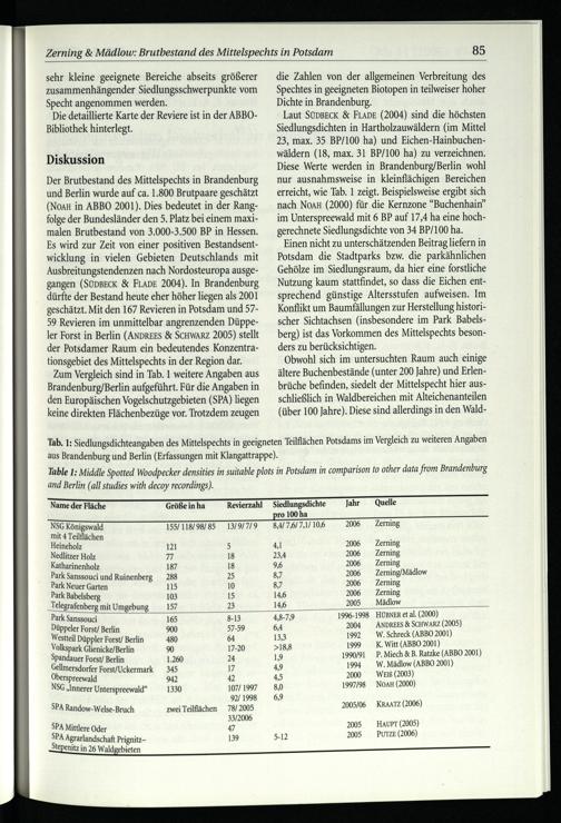 Laut SÜDBECK& FLADE(2004) sind die höchsten Siedlungsdichten in Hartholzauwäldern(im Mittel 23, max. 35 BP/100 ha) und Eichen-Hainbuchenwäldern(18, max. 31 BP/100 ha) zu verzeichnen. Diese Werte werden in Brandenburg/Berlin wohl nur ausnahmsweise in kleinflächigen Bereichen erreicht, wie Tab. 1 zeigt. Beispielsweise ergibt sich nach Noay(2000) für die Kernzone“Buchenhain” im Unterspreewald mit 6 BP auf 17,4 ha eine hochgerechnete Siedlungsdichte von 34 BP/100 ha.