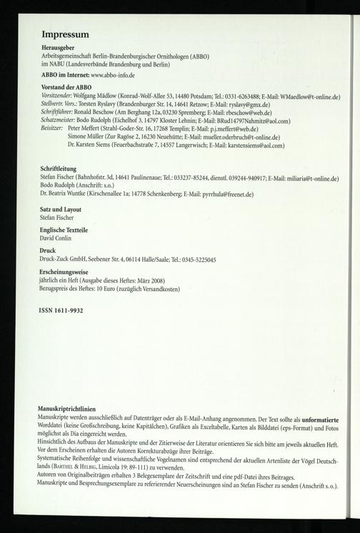 Stefan Fischer(Bahnhofstr. 3d, 14641 Paulinenaue ; Tel.: 033237-85244, dienstl. 039244-940917; E-Mail: miliaria@t-online.de) Bodo Rudolph(Anschrift: s.0.)