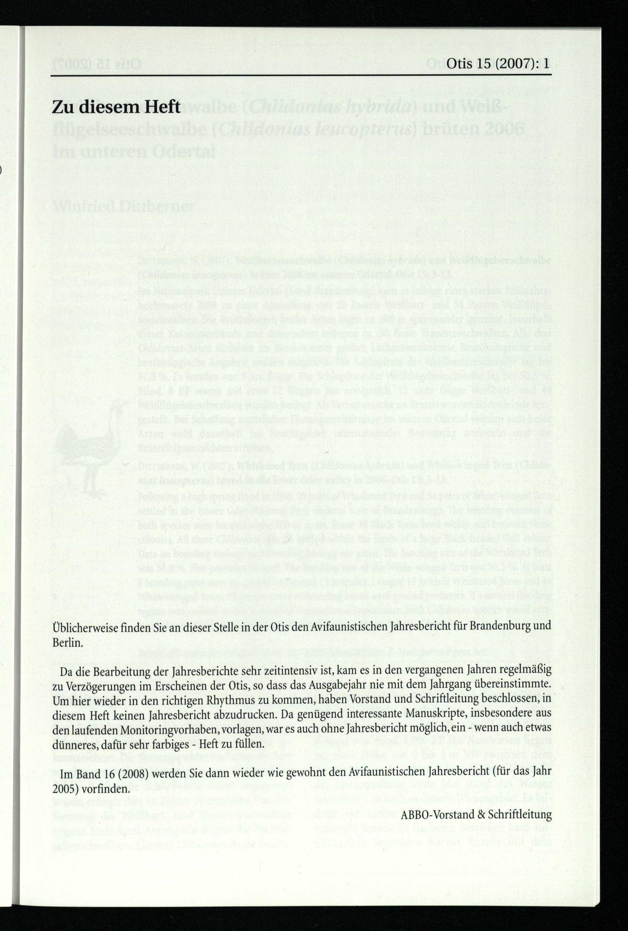 Da die Bearbeitung der Jahresberichte sehr zeitintensiv ist, kam es in den vergangenen Jahren regelmäßig zu Verzögerungen im Erscheinen der Otis, so dass das Ausgabejahr nie mit dem Jahrgang übereinstimmte. Um hier wieder in den richtigen Rhythmus zu kommen, haben Vorstand und Schriftleitung beschlossen, in diesem Heft keinen Jahresbericht abzudrucken. Da genügend interessante Manuskripte, insbesondere aus den laufenden Monitoringvorhaben, vorlagen, war es auch ohne Jahresbericht möglich, ein- wenn auch etwas dünneres, dafür sehr farbiges- Heft zu füllen.