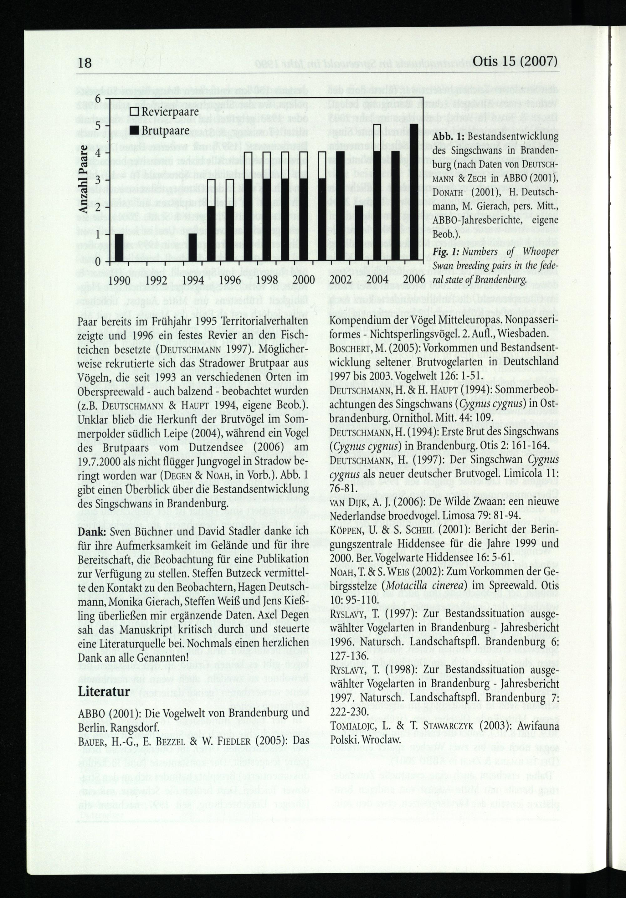 Paar bereits im Frühjahr 1995 Territorialverhalten zeigte und 1996 ein festes Revier an den Fisch­teichen besetzte(DEUTSCHMANN 1997). Möglicher­weise rekrutierte sich das Stradower Brutpaar aus Vögeln, die seit 1993 an verschiedenen Orten im Oberspreewald - auch balzend- beobachtet wurden (z.B. DEUTSCHMANN& HAUPT 1994, eigene Beob.). Unklar blieb die Herkunft der Brutvögel im Som­merpolder südlich Leipe(2004), während ein Vogel des Brutpaars vom Dutzendsee(2006) am 19.7.2000 als nicht flügger Jungvogel in Stradow be­ringt worden war(DEGEN& NoaH, in Vorb.). Abb. 1 gibt einen Überblick über die Bestandsentwicklung des Singschwans in Brandenburg .