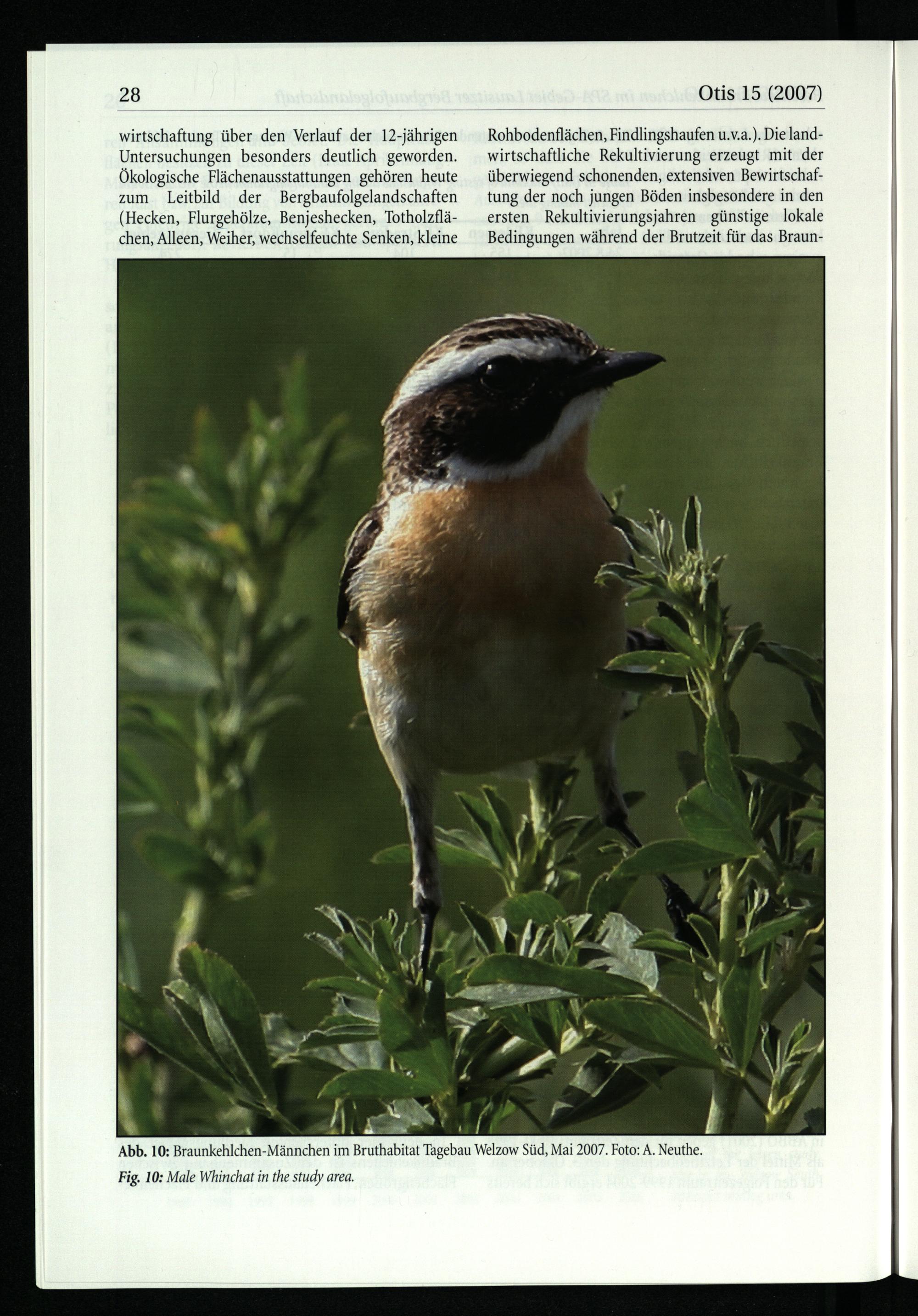 Abb. 10: Braunkehlchen-Männchen im Bruthabitat Tagebau Welzow Süd, Mai 2007. Foto: A. Neuthe.