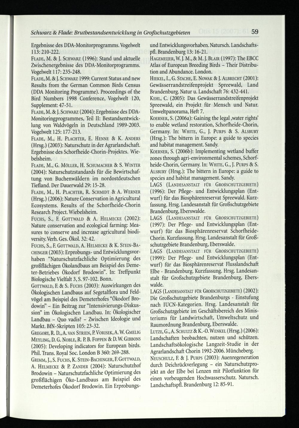 GREGORY, R. D., A. VAN STRIEN, P. VORISEK, A. W. GMELIG MEYLING, D. G. NoBLE, R. P. B. FOPPEN& D. W. GIBBONS (2005): Developing indicators for European birds. Phil. Trans. Royal Soc. London B 360: 269-288. GRIMM, J., S. FUCHS, K. STEIN-BACHINGER, E GOTTWALD, A. HELMECKE& P. ZANDER(2004): Naturschutzhof Brodowin— Naturschutzfachliche Optimierung des großflächigen Öko-Landbaus am Beispiel des Demeterhofes Ökodorf Brodowin. Ein Erprobungs