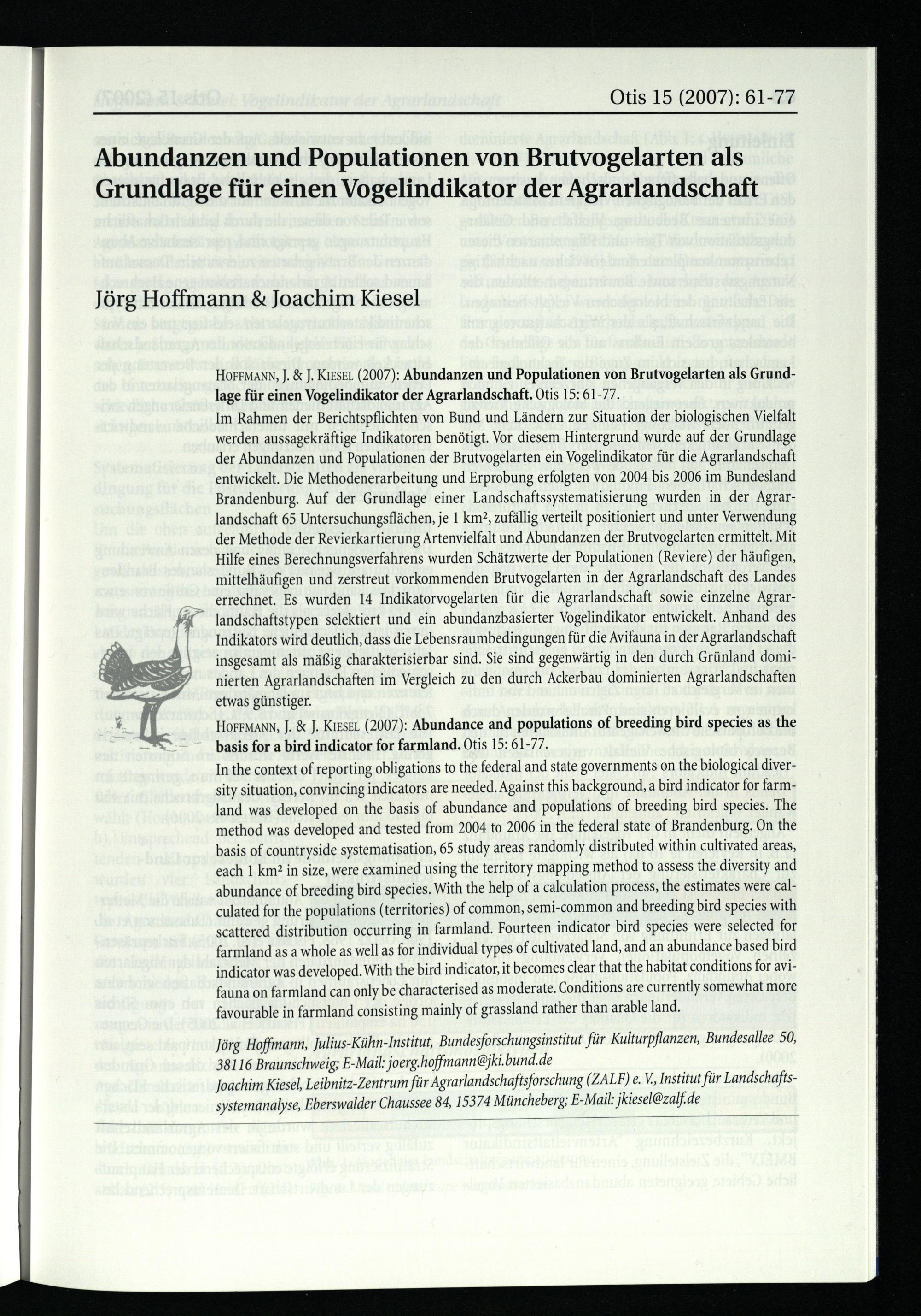 HOFFMANN, J.& J. Kızser(2007): Abundanzen und Populationen von Brutvogelarten als Grundlage für einen Vogelindikator der Agrarlandschaft. Otis 15: 61-77. Im Rahmen der Berichtspflichten von Bund und Ländern zur Situation der biologischen Vielfalt werden aussagekräftige Indikatoren benötigt. Vor diesem Hintergrund wurde auf der Grundlage der Abundanzen und Populationen der Brutvogelarten ein Vogelindikator für die Agrarlandschaft entwickelt. Die Methodenerarbeitung und Erprobung erfolgten von 2004 bis 2006 im Bundesland Brandenburg . Auf der Grundlage einer Landschaftssystematisierung wurden in der Agrarlandschaft 65 Untersuchungsflächen, je 1 km?2, zufällig verteilt positioniert und unter Verwendung der Methode der Revierkartierung Artenvielfalt und Abundanzen der Brutvogelarten ermittelt. Mit Hilfe eines Berechnungsverfahrens wurden Schätzwerte der Populationen(Reviere) der häufigen, mittelhäufigen und zerstreut vorkommenden Brutvogelarten in der Agrarlandschaft des Landes errechnet. Es wurden 14 Indikatorvogelarten für die Agrarlandschaft sowie einzelne Agrar( landschaftstypen selektiert und ein abundanzbasierter Vogelindikator entwickelt. Anhand des Indikators wird deutlich, dass die Lebensraumbedingungen für die Avifauna in der Agrarlandschaft insgesamt als mäßig charakterisierbar sind. Sie sind gegenwärtig in den durch Grünland dominierten Agrarlandschaften im Vergleich zu den durch Ackerbau dominierten Agrarlandschaften etwas günstiger. HOFFMANN, J.& J. Kızser.(2007): Abundance and populations of breeding bird species as the basis for a bird indicator for farmland. Otis 15: 61-77. In the context of reporting obligations to the federal and state governments on the biological diversity situation, convincing indicators are needed, Against this background, a bird indicator for farmland was developed on the basis of abundance and populations of breeding bird species. The method was developed and tested from 2004 to 2006 in the federal state of Brandenburg . On the basis of countryside systematisation, 65 study areas randomly distributed within cultivated areas, each 1 km? in size, were examined using the territory mapping method to assess the diversity and abundance of breeding bird species. With the help of a calculation process, the estimates were calculated for the populations(territories) of common, semi-common and breeding bird species with scattered distribution occurring in farmland. Fourteen indicator bird species were selected for farmland as a whole as well as for individual types of cultivated land, and an abundance based bird indicator was developed. With the bird indicator, it becomes clear that the habitat conditions for avifauna on farmland can only be characterised as moderate. Conditions are currently somewhat more favourable in farmland consisting mainly of grassland rather than arable land.