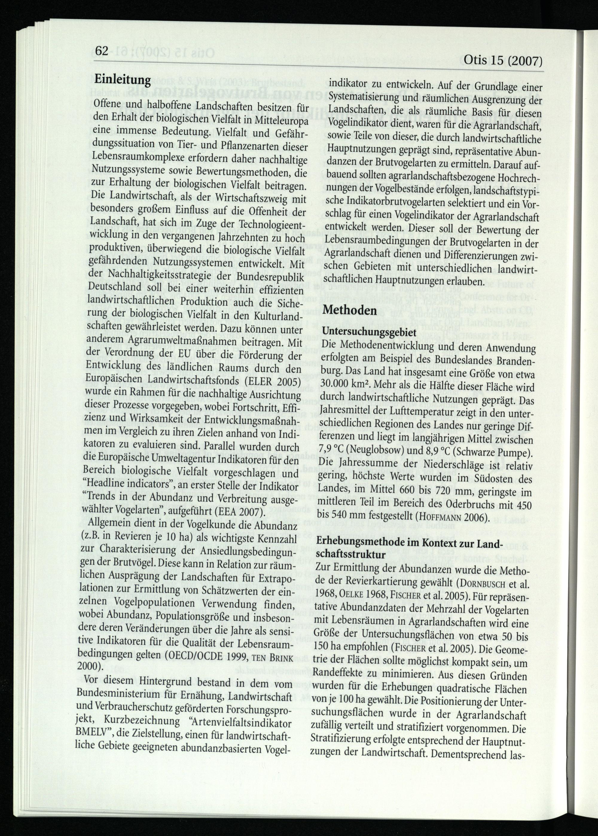 Offene und halboffene Landschaften besitzen für den Erhalt der biologischen Vielfalt in Mitteleuropa eine immense Bedeutung. Vielfalt und Gefährdungssituation von Tier- und Pflanzenarten dieser Lebensraumkomplexe erfordern daher nachhaltige Nutzungssysteme sowie Bewertungsmethoden, die zur Erhaltung der biologischen Vielfalt beitragen. Die Landwirtschaft, als der Wirtschaftszweig mit besonders großem Einfluss auf die Offenheit der Landschaft, hat sich im Zuge der Technologieentwicklung in den vergangenen Jahrzehnten zu hoch produktiven, überwiegend die biologische Vielfalt gefährdenden Nutzungssystemen entwickelt. Mit der Nachhaltigkeitsstrategie der Bundesrepublik Deutschland soll bei einer weiterhin effizienten landwirtschaftlichen Produktion auch die Sicherung der biologischen Vielfalt in den Kulturlandschaften gewährleistet werden. Dazu können unter anderem Agrarumweltmaßnahmen beitragen. Mit der Verordnung der EU über die Förderung der Entwicklung des ländlichen Raums durch den Europäischen Landwirtschaftsfonds(ELER 2005) wurde ein Rahmen für die nachhaltige Ausrichtung dieser Prozesse vorgegeben, wobei Fortschritt, Effizienz und Wirksamkeit der Entwicklungsmaßnahmen im Vergleich zu ihren Zielen anhand von Indikatoren zu evaluieren sind. Parallel wurden durch die Europäische Umweltagentur Indikatoren für den Bereich biologische Vielfalt vorgeschlagen und “Headline indicators”, an erster Stelle der Indikator “Trends in der Abundanz und Verbreitung ausgewählter Vogelarten”, aufgeführt(EEA 2007).