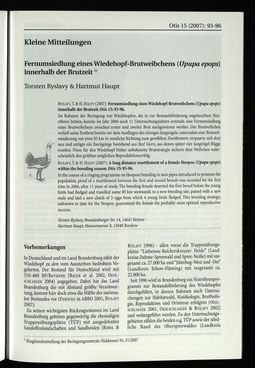 RYSLAVY, T.& H. HAUPT(2007): Fernumsiedlung eines Wiedehopf-Brutweibchens(Upupa epops ) innerhalb der Brutzeit. Otis 15: 93-96. Im Rahmen der Beringung von Wiedehopfen, die in zur Bestandsförderung angebrachten Niströhren brüten, konnte im Jahr 2006 nach 11 Untersuchungsjahren erstmals eine Fernumsiedlung eines Brutweibchens zwischen erster und zweiter Brut nachgewiesen werden. Das Brutweibchen verließ seine Erstbrut bereits vor dem Ausfliegen des einzigen Jungvogels, unternahm eine Brutzeitwanderung von etwa 85 km in westliche Richtung zum gewählten Zweitbrutort, verpaarte sich dort > neu und zeitigte ein Zweitgelege bestehend aus fünf Eiern, aus denen später vier Jungvögel flügge wurden. Diese für den Wiedehopf bisher unbekannte Brutstrategie sicherte dem Weibchen wahrscheinlich den größten möglichen Reproduktionserfolg.