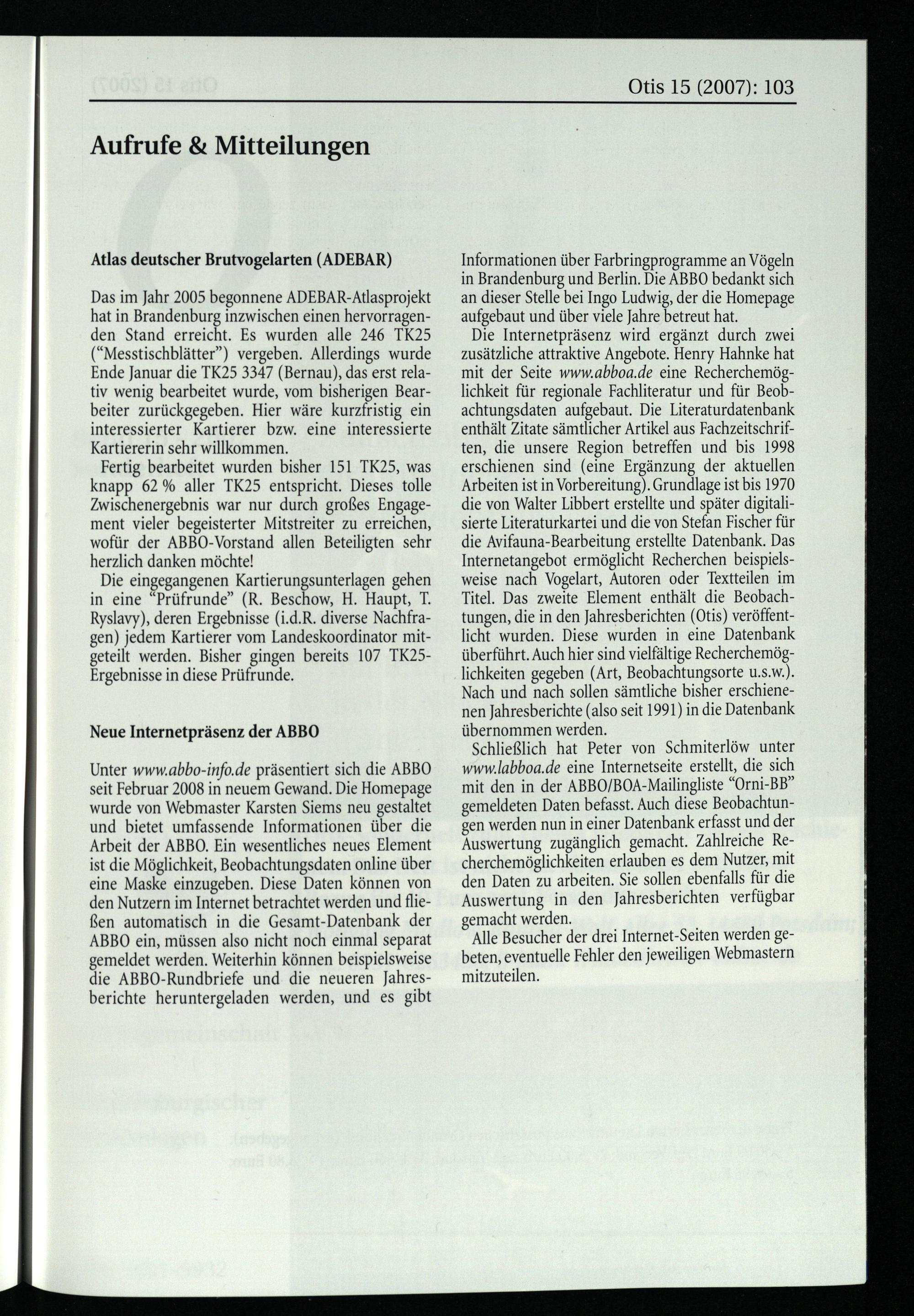 Die Internetpräsenz wird ergänzt durch zwei zusätzliche attraktive Angebote. Henry Hahnke hat mit der Seite www.abboa.de eine Recherchemöglichkeit für regionale Fachliteratur und für Beobachtungsdaten aufgebaut. Die Literaturdatenbank enthält Zitate sämtlicher Artikel aus Fachzeitschriften, die unsere Region betreffen und bis 1998 erschienen sind(eine Ergänzung der aktuellen Arbeiten ist in Vorbereitung). Grundlage ist bis 1970 die von Walter Libbert erstellte und später digitalisierte Literaturkartei und die von Stefan Fischer für die Avifauna-Bearbeitung erstellte Datenbank. Das Internetangebot ermöglicht Recherchen beispielsweise nach Vogelart, Autoren oder Textteilen im Titel. Das zweite Element enthält die Beobachtungen, die in den Jahresberichten(Otis) veröffentlicht wurden. Diese wurden in eine Datenbank überführt. Auch hier sind vielfältige Recherchemöglichkeiten gegeben(Art, Beobachtungsorte u.s.W.). Nach und nach sollen sämtliche bisher erschienenen Jahresberichte(also seit 1991) in die Datenbank übernommen werden.