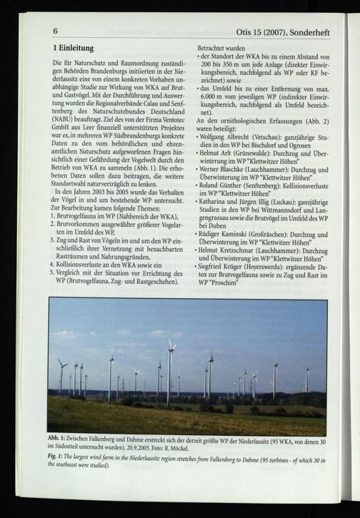 Die für Naturschutz und Raumordnung zuständi­gen Behörden Brandenburgs initiierten in der Nie­ derlausitz eine von einem konkreten Vorhaben un­abhängige Studie zur Wirkung von WKA auf Brut­und Gastvögel. Mit der Durchführung und Auswer­tung wurden die Regionalverbände Calau und Senf­ tenberg des Naturschutzbundes Deutschland