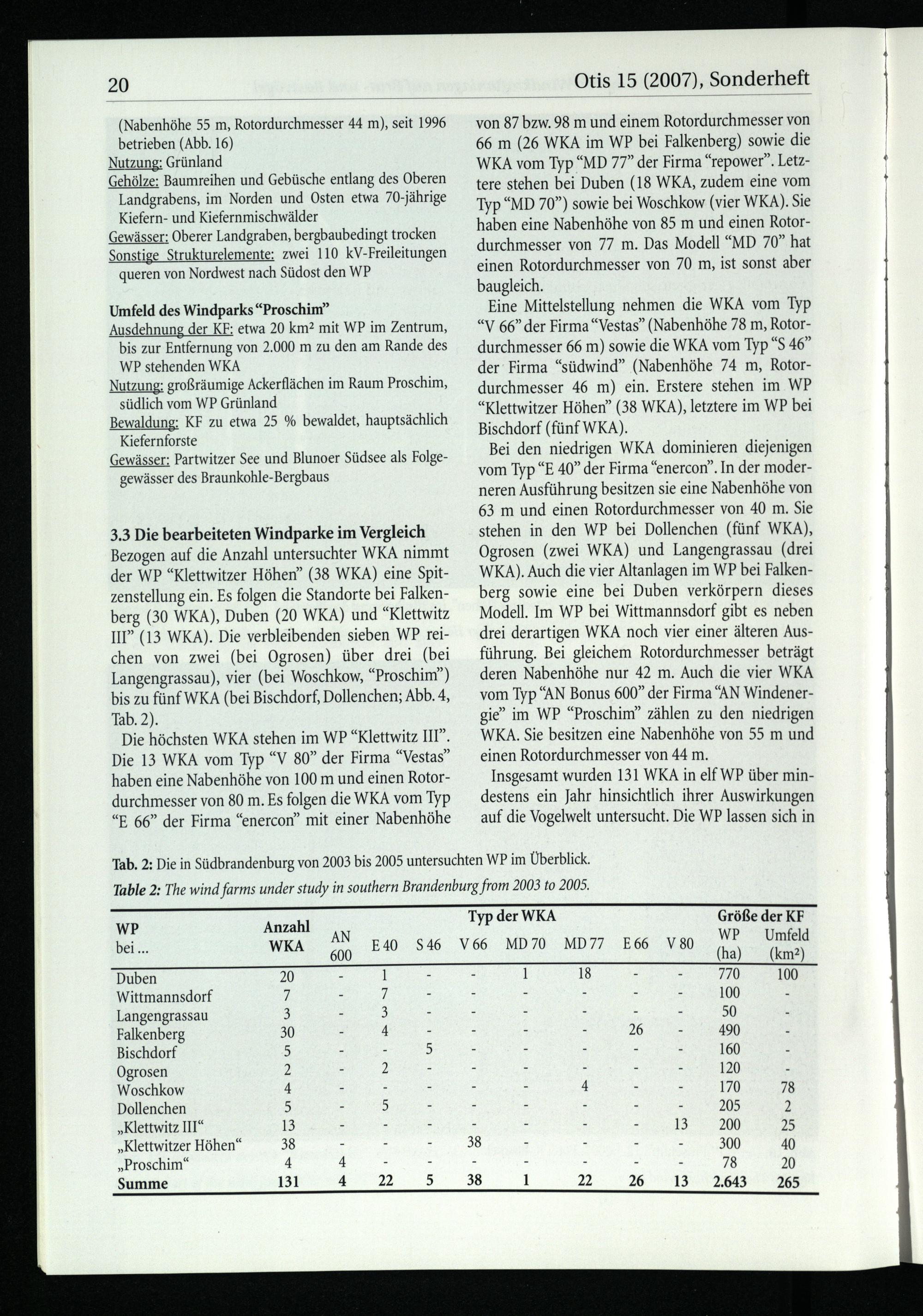 Tab. 2: Die in Südbrandenburg von 2003 bis 2005 untersuchten WP im Überblick. Table 2: The wind farms under study in southern Brandenburg from 2003 to 2005.