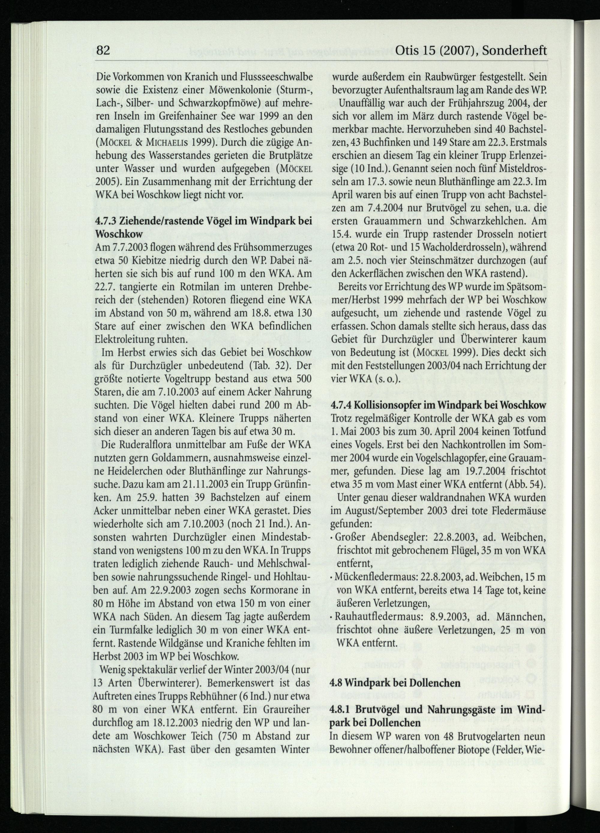Die Ruderalflora unmittelbar am Fuße der WKA nutzten gern Goldammern, ausnahmsweise einzelne Heidelerchen oder Bluthänflinge zur Nahrungssuche. Dazu kam am 21.11.2003 ein Trupp Grünfinken. Am 25.9. hatten 39 Bachstelzen auf einem Acker unmittelbar neben einer WKA gerastet. Dies wiederholte sich am 7.10.2003(noch 21 Ind .). Ansonsten wahrten Durchzügler einen Mindestabstand von wenigstens 100 m zu den WKA. In Trupps traten lediglich ziehende Rauch- und Mehlschwalben sowie nahrungssuchende Ringel- und Hohltauben auf. Am 22.9.2003 zogen sechs Kormorane in 80 m Höhe im Abstand von etwa 150 m von einer WKA nach Süden. An diesem Tag jagte außerdem ein Turmfalke lediglich 30 m von einer WKA entfernt. Rastende Wildgänse und Kraniche fehlten im Herbst 2003 im WP bei Woschkow.