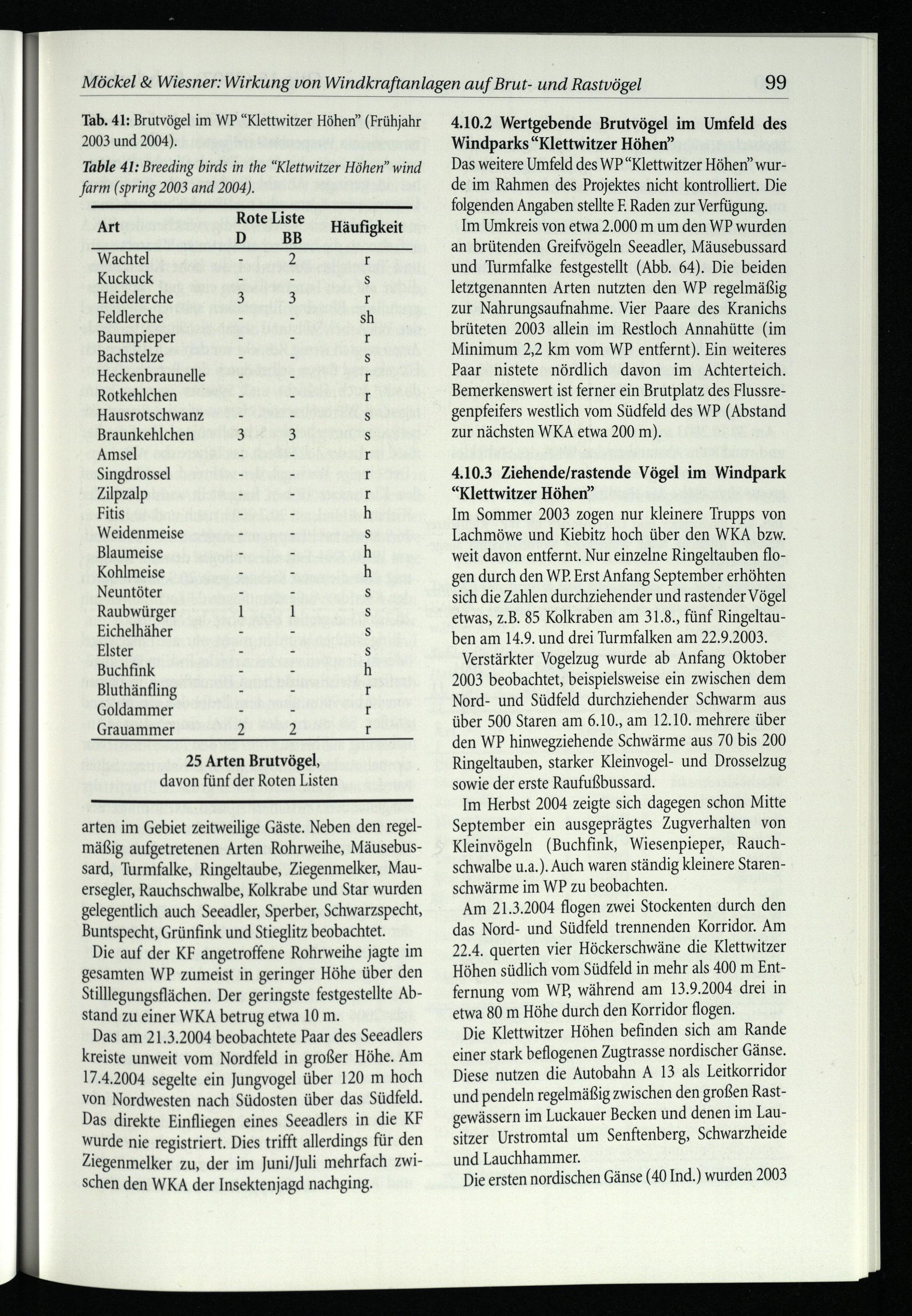 Table 41: Breeding birds in the“Klettwitzer Höhen” wind farm(spring 2003 and 2004).