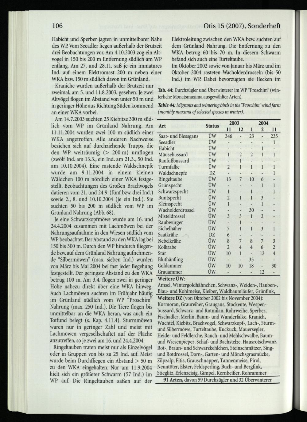 Tab. 44: Durchzügler und Überwinterer im WP“Proschim”(winterliche Monatsmaxima ausgewählter Arten). Table 44: Migrants and wintering birds in the“Proschim” wind farm (monthly maxima of selected species in winter).