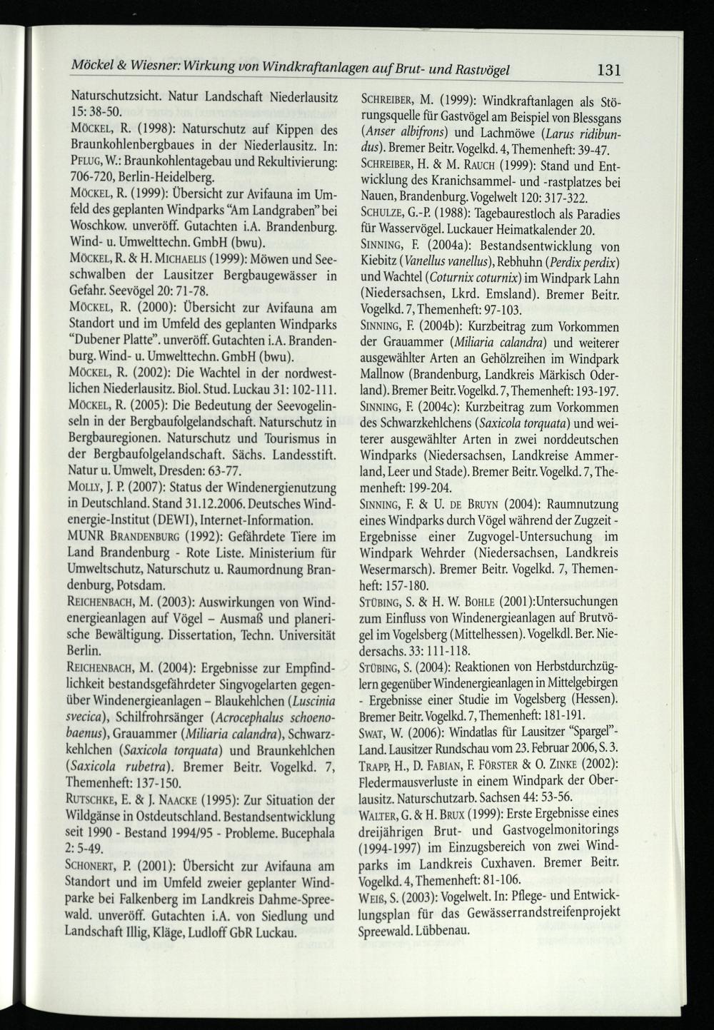SCHREIBER, M.(1999): Windkraftanlagen als Störungsquelle für Gastvögel am Beispiel von Blessgans (Anser albifrons ) und Lachmöwe(Larus ridibun dus ). Bremer Beitr. Vogelkd. 4, Themenheft: 39-47. SCHREIBER, H.& M. RAUCH(1999): Stand und Entwicklung des Kranichsammel- und-rastplatzes bei Nauen , Brandenburg . Vogelwelt 120: 317-322. SCHULZE, G.-P.(1988): Tagebaurestloch als Paradies für Wasservögel. Luckauer Heimatkalender 20. SINNING, E(2004a): Bestandsentwicklung von Kiebitz ( Vanellus vanellus ), Rebhuhn(Perdix perdix) und Wachtel(Coturnix coturnix ) im Windpark Lahn (Niedersachsen , Lkrd. Emsland ). Bremer Beitr. Vogelkd. 7, Themenheft: 97-103.