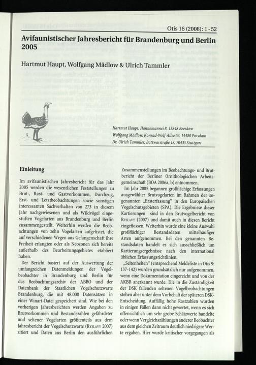 Im avifaunistischen Jahresbericht für das Jahr 2005 werden die wesentlichen Feststellungen zu Brut-, Rast- und Gastvorkommen, Durchzug, Erst- und Letztbeobachtungen sowie sonstigen interessanten Sachverhalten von 273 in diesem Jahr nachgewiesenen und als Wildvögel eingestuften Vogelarten aus Brandenburg und Berlin zusammengestellt. Weiterhin werden die Beobachtungen von zehn Vogelarten aufgelistet, die auf verschiedenen Wegen aus Gefangenschaft ihre Freiheit erlangten oder als Neozonen sich bereits außerhalb des Bearbeitungsgebietes etabliert haben.