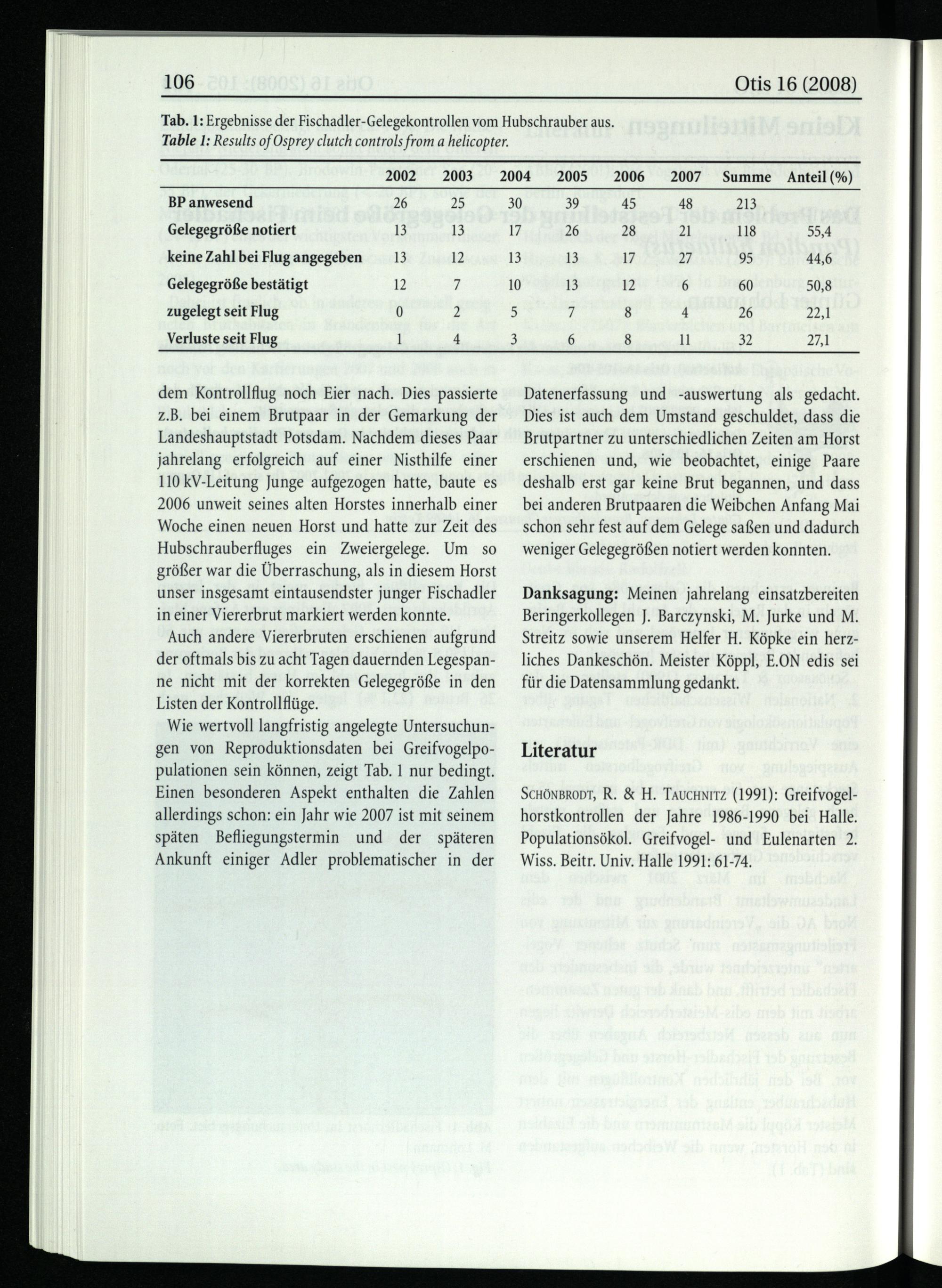 Danksagung: Meinen jahrelang einsatzbereiten Beringerkollegen J. Barczynski, M. Jurke und M. Streitz sowie unserem Helfer H. Köpke ein herzliches Dankeschön. Meister Köppl, E.ON edis sei für die Datensammlung gedankt.