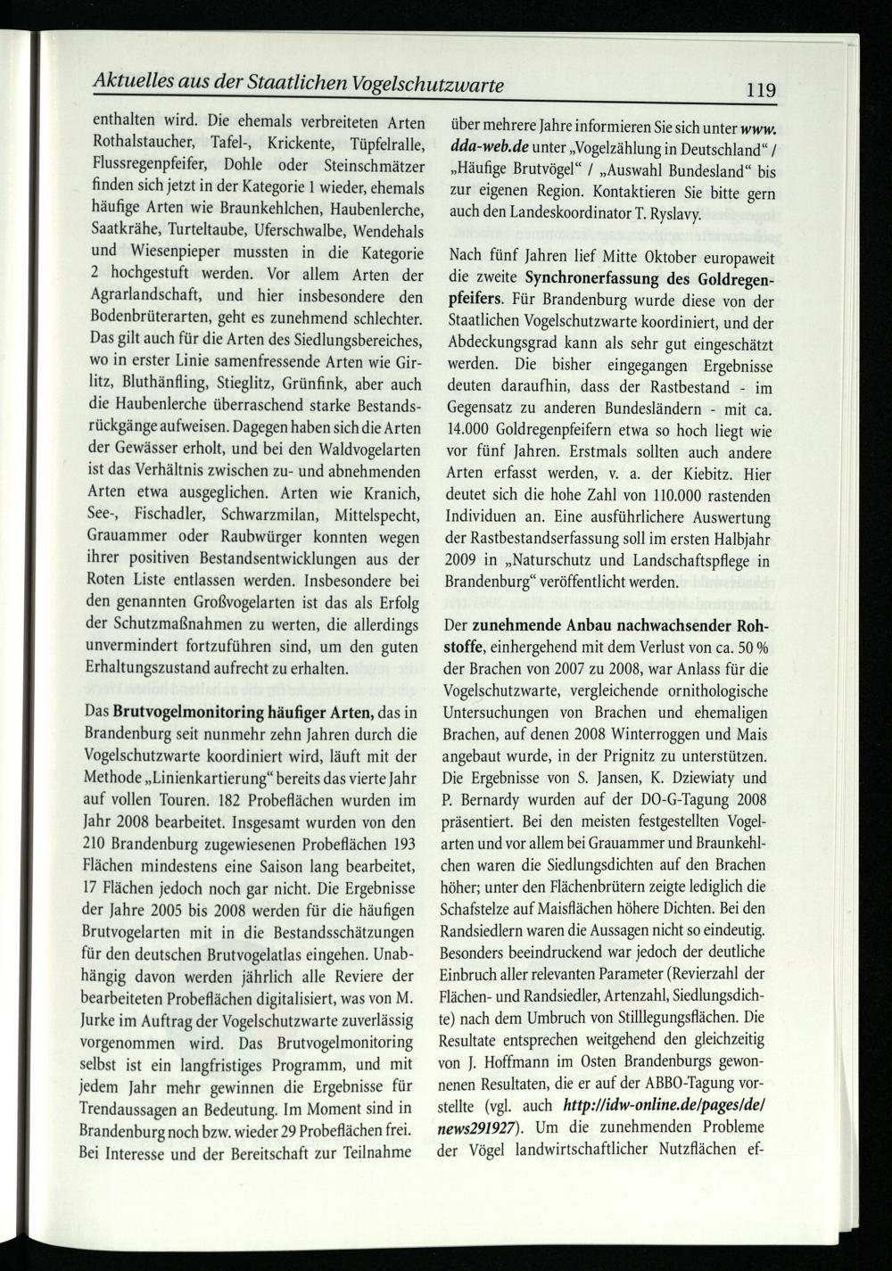 Das Brutvogelmonitoring häufiger Arten, das in Brandenburg seit nunmehr zehn Jahren durch die Vogelschutzwarte koordiniert wird, läuft mit der Methode„Linienkartierung“ bereits das vierte Jahr auf vollen Touren. 182 Probeflächen wurden im Jahr 2008 bearbeitet. Insgesamt wurden von den 210 Brandenburg zugewiesenen Probeflächen 193 Flächen mindestens eine Saison lang bearbeitet, 17 Flächen jedoch noch gar nicht. Die Ergebnisse der Jahre 2005 bis 2008 werden für die häufigen Brutvogelarten mit in die Bestandsschätzungen für den deutschen Brutvogelatlas eingehen. Unabhängig davon werden jährlich alle Reviere der bearbeiteten Probeflächen digitalisiert, was von M. Jurke im Auftrag der Vogelschutzwarte zuverlässig vorgenommen wird. Das Brutvogelmonitoring selbst ist ein langfristiges Programm, und mit jedem Jahr mehr gewinnen die Ergebnisse für Trendaussagen an Bedeutung. Im Moment sind in Brandenburg noch bzw. wieder 29 Probeflächen frei. Bei Interesse und der Bereitschaft zur Teilnahme