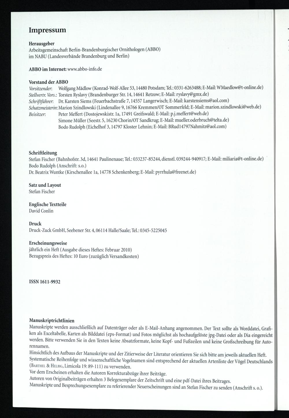 Stefan Fischer(Bahnhofstr. 3d, 14641 Paulinenaue ; Tel.: 033237-85244, dienstl. 039244-940917; E-Mail: miliaria@t-online.de) Bodo Rudolph(Anschrift: s.0.)
