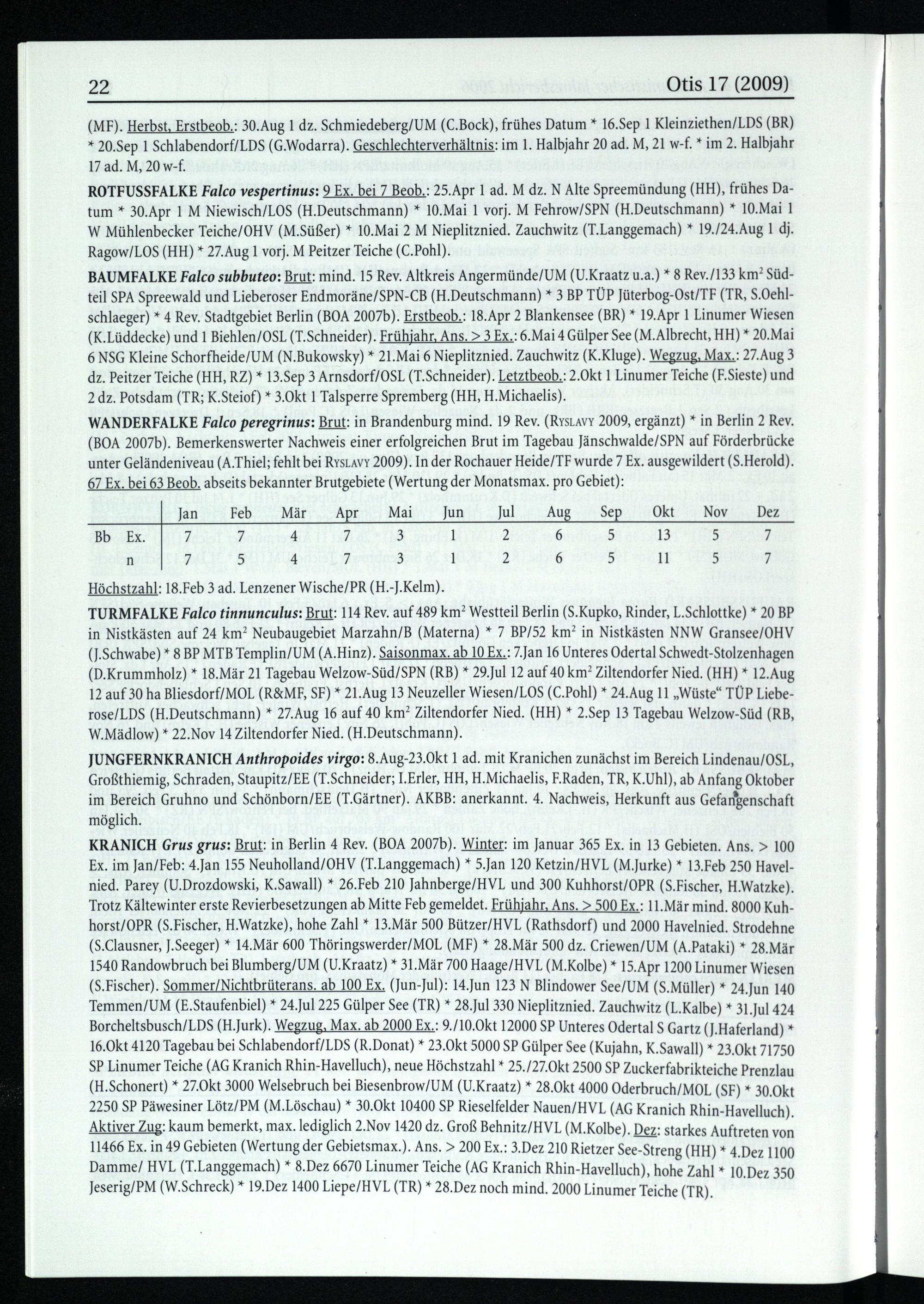 BAUMFALKE Falco subbuteo : Brut: mind. 15 Rev. Altkreis Angermünde/UM (U.Kraatz u.a.)* 8 Rev./133 km* Südteil SPA Spreewald und Lieberoser Endmoräne/SPN -CB(H.Deutschmann)* 3 BP TÜP Jüterbog-Ost/TF(TR, S.Oehlschlaeger)* 4 Rev. Stadtgebiet Berlin(BOA 2007b). Erstbeob.: 18.Apr 2 Blankensee(BR )* 19.Apr 1 Linumer Wiesen (K.Lüddecke) und 1 Biehlen/OSL (T.Schneider). Frühjahr, Ans.> 3 Ex.: 6.Mai 4 Gülper See(M.Albrecht, HH )* 20.Mai 6 NSG Kleine Schorfheide/UM(N.Bukowsky)* 21.Mai 6 Nieplitznied. Zauchwitz (K.Kluge). Wegzug, Max.: 27.Aug 3 dz. Peitzer Teiche(HH , RZ)* 13.Sep 3 Arnsdorf/OSL (T.Schneider). Letztbeob.: 2.Okt 1 Linumer Teiche(F.Sieste) und 2 dz. Potsdam (TR; K.Steiof)* 3.Okt 1 Talsperre Spremberg (HH , H.Michaelis).