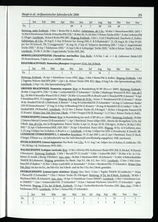 Heimzug, Erstbeob.: 26.Apr 1 Güstebieser Loose(HH ). Max.: 5.Mai 3 Breite/PM(L.Kalbe). Wegzug, Erstbeob.: 1.Jul 2 Tagebau Welzow-Süd/SPN (RB)* 2.Jul 1 dz. Peitzer Teiche(HH , RZ). Max.: 9.Aug 5 dz. Alte Spreemündung(HH ). Letztbeob.: 2.Sep 1 dz. Alte Spreemündung(HH ).