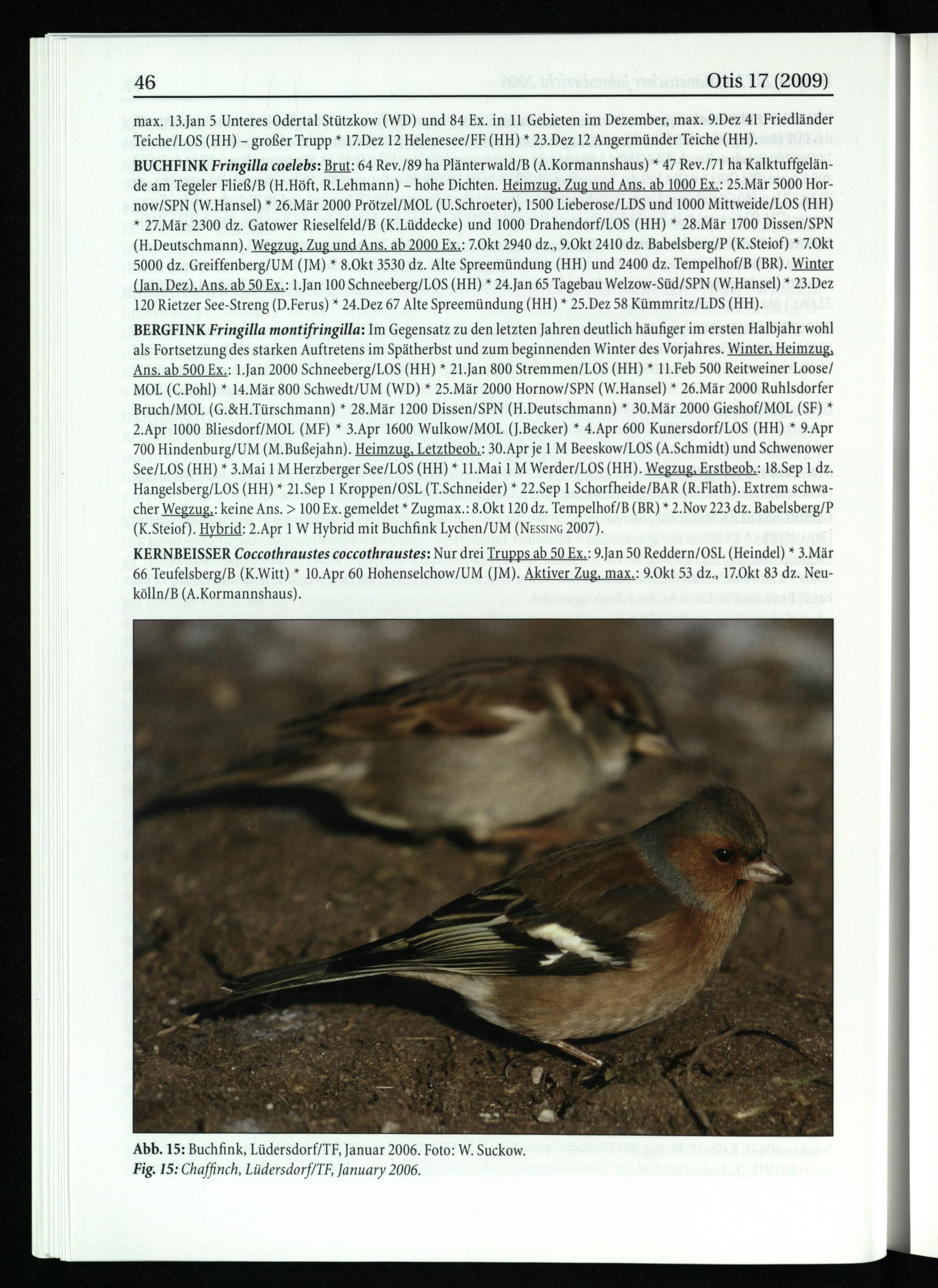 BUCHFINK Fringilla coelebs: Brut: 64 Rev./89 ha Plänterwald/B(A.Kormannshaus)* 47 Rev./71 ha Kalktuffgelände am Tegeler Fließ/B(H.Höft, R.Lehmann)- hohe Dichten. Heimzug, Zug und Ans. ab 1000 Ex.: 25.Mär 5000 Hornow/SPN (W.Hansel)* 26.Mär 2000 Prötzel/MOL (U.Schroeter), 1500 Lieberose/LDS und 1000 Mittweide/LOS (HH) * 27.Mär 2300 dz. Gatower Rieselfeld/B(K.Lüddecke) und 1000 Drahendorf/LOS(HH)* 28.Mär 1700 Dissen/SPN (H.Deutschmann). Wegzug, Zug und Ans. ab 2000 Ex.: 7.Okt 2940 dz., 9.Okt 2410 dz. Babelsberg/P (K.Steiof)* 7.Okt 5000 dz. Greiffenberg/UM (JM)* 8.Okt 3530 dz. Alte Spreemündung(HH ) und 2400 dz. Tempelhof/B(BR ). Winter (Jan, Dez), Ans. ab 50 Ex.: 1.Jan 100 Schneeberg/LOS(HH )* 24.Jan 65 Tagebau Welzow-Süd/SPN (W.Hansel)* 23.Dez 120 Rietzer See-Streng(D.Ferus)* 24.Dez 67 Alte Spreemündung(HH )* 25.Dez 58 Kümmritz/LDS (HH).