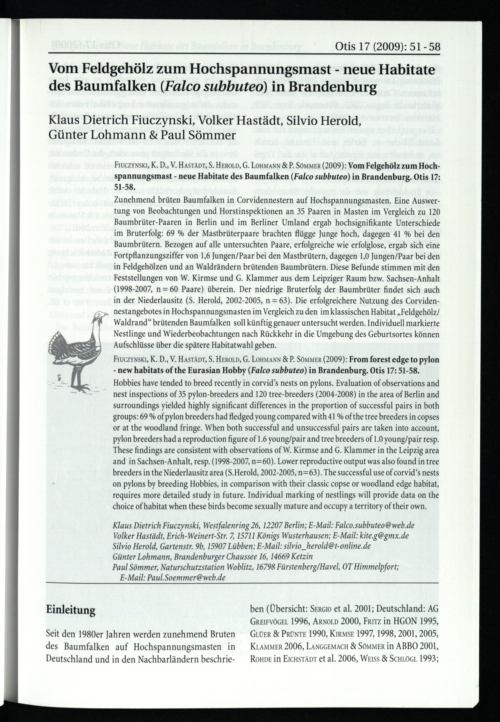 Fıuczynskı, K. D., V. HASTADT, S. HEROLD, G. LOHMANN& P. SömmMEr(2009): Vom Felgehölz zum Hochspannungsmast- neue Habitate des Baumfalken(Falco subbuteo ) in Brandenburg . Otis 17: 51-58. Zunehmend brüten Baumfalken in Corvidennestern auf Hochspannungsmasten. Eine Auswertung von Beobachtungen und Horstinspektionen an 35 Paaren in Masten im Vergleich zu 120 Baumbrüter-Paaren in Berlin und im Berliner Umland ergab hochsignifikante Unterschiede im Bruterfolg: 69% der Mastbrüterpaare brachten flügge Junge hoch, dagegen 41% bei den Baumbrütern. Bezogen auf alle untersuchten Paare, erfolgreiche wie erfolglose, ergab sich eine Fortpflanzungsziffer von 1,6 Jungen/Paar bei den Mastbrütern, dagegen 1,0 Jungen/Paar bei den in Feldgehölzen und an Waldrändern brütenden Baumbrütern. Diese Befunde stimmen mit den Feststellungen von W. Kirmse und G. Klammer aus dem Leipziger Raum bzw. Sachsen-Anhalt (1998-2007, n= 60 Paare) überein. Der niedrige Bruterfolg der Baumbrüter findet sich auch in der Niederlausitz (S. Herold, 2002-2005, n= 63). Die erfolgreichere Nutzung des Corviden„ nestangebotes in Hochspannungsmasten im Vergleich zu den im klassischen Habitat„Feldgehölz/ Waldrand“ brütenden Baumfalken soll künftig genauer untersucht werden. Individuell markierte Nestlinge und Wiederbeobachtungen nach Rückkehr in die Umgebung des Geburtsortes können Aufschlüsse über die spätere Habitatwahl geben.