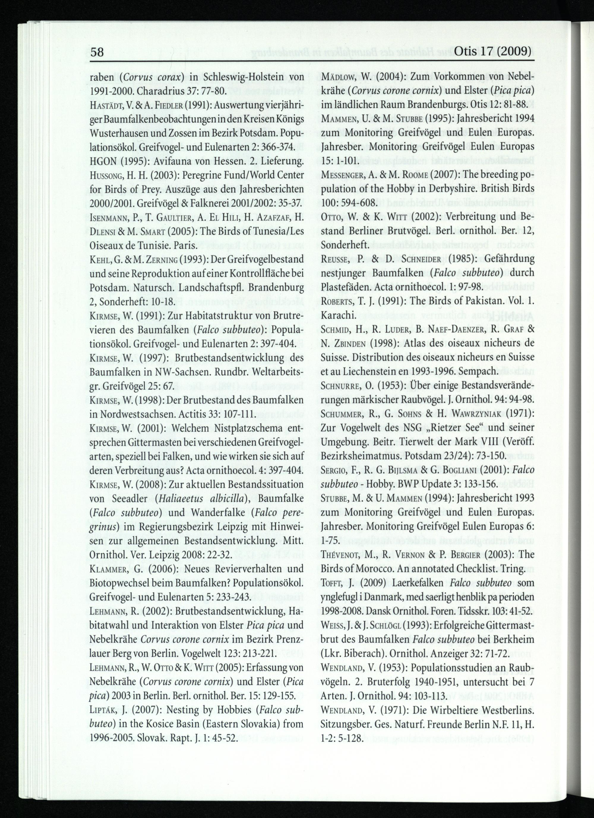 LEHMANN, R.(2002): Brutbestandsentwicklung, Habitatwahl und Interaktion von Elster Pica pica und Nebelkrähe Corvus corone cornix im Bezirk Prenz lauer Berg von Berlin . Vogelwelt 123: 213-221. LEHMANN, R., W. OTTo& K. Wırt(2005): Erfassung von Nebelkrähe(Corvus corone cornix) und Elster(Pica pica) 2003 in Berlin . Berl. ornithol. Ber. 15: 129-155. LıpTAg, J.(2007): Nesting by Hobbies(Falco sub buteo ) in the Kosice Basin(Eastern Slovakia) from 1996-2005. Slovak . Rapt. J. 1: 45-52.