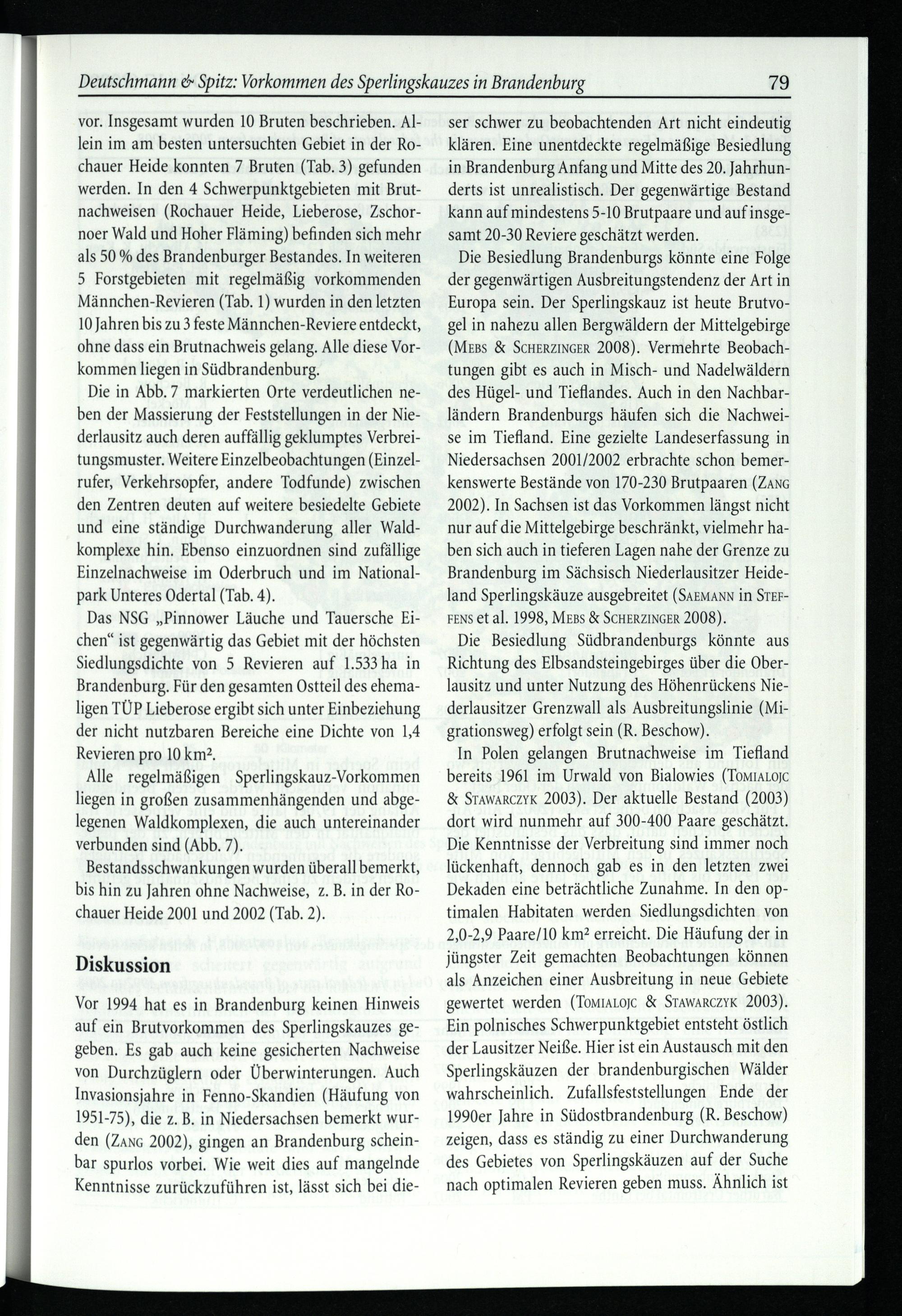 In Polen gelangen Brutnachweise im Tiefland bereits 1961 im Urwald von Bialowies (TomIALOJC & StAwArczyK 2003). Der aktuelle Bestand(2003) dort wird nunmehr auf 300-400 Paare geschätzt. Die Kenntnisse der Verbreitung sind immer noch lückenhaft, dennoch gab es in den letzten zwei Dekaden eine beträchtliche Zunahme. In den optimalen Habitaten werden Siedlungsdichten von 2,0-2,9 Paare/10 km? erreicht. Die Häufung der in jüngster Zeit gemachten Beobachtungen können als Anzeichen einer Ausbreitung in neue Gebiete gewertet werden(Tom1ALOJc& STAWARCZYK 2003). Ein polnisches Schwerpunktgebiet entsteht östlich der Lausitzer Neiße . Hier ist ein Austausch mit den Sperlingskäuzen der brandenburgischen Wälder wahrscheinlich. Zufallsfeststellungen Ende der 1990er Jahre in Südostbrandenburg(R. Beschow) zeigen, dass es ständig zu einer Durchwanderung des Gebietes von Sperlingskäuzen auf der Suche nach optimalen Revieren geben muss. Ähnlich ist