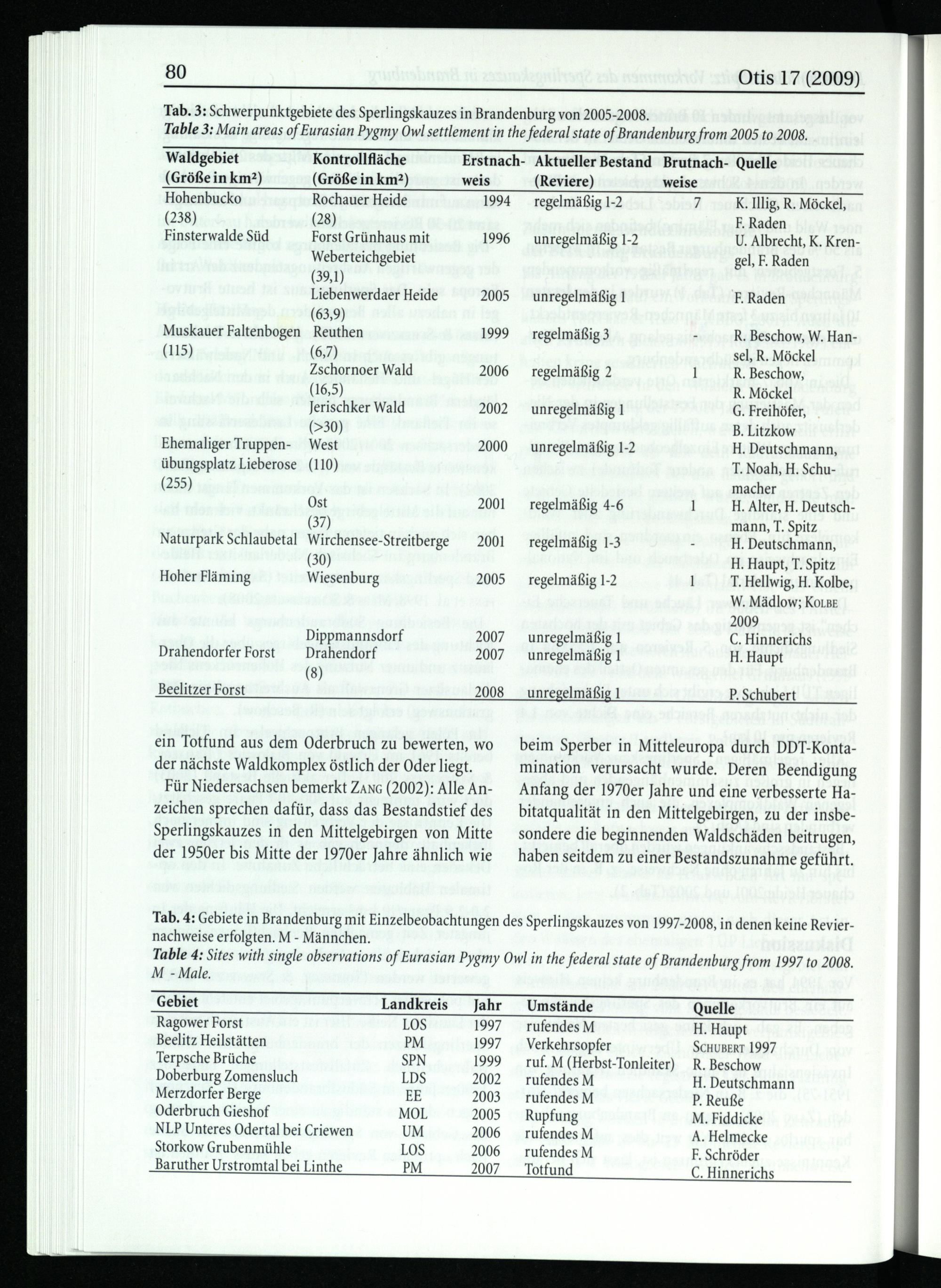 ein Totfund aus dem Oderbruch zu bewerten, wo der nächste Waldkomplex östlich der Oder liegt. Für Niedersachsen bemerkt Zanc(2002): Alle Anzeichen sprechen dafür, dass das Bestandstief des Sperlingskauzes in den Mittelgebirgen von Mitte der 1950er bis Mitte der 1970er Jahre ähnlich wie