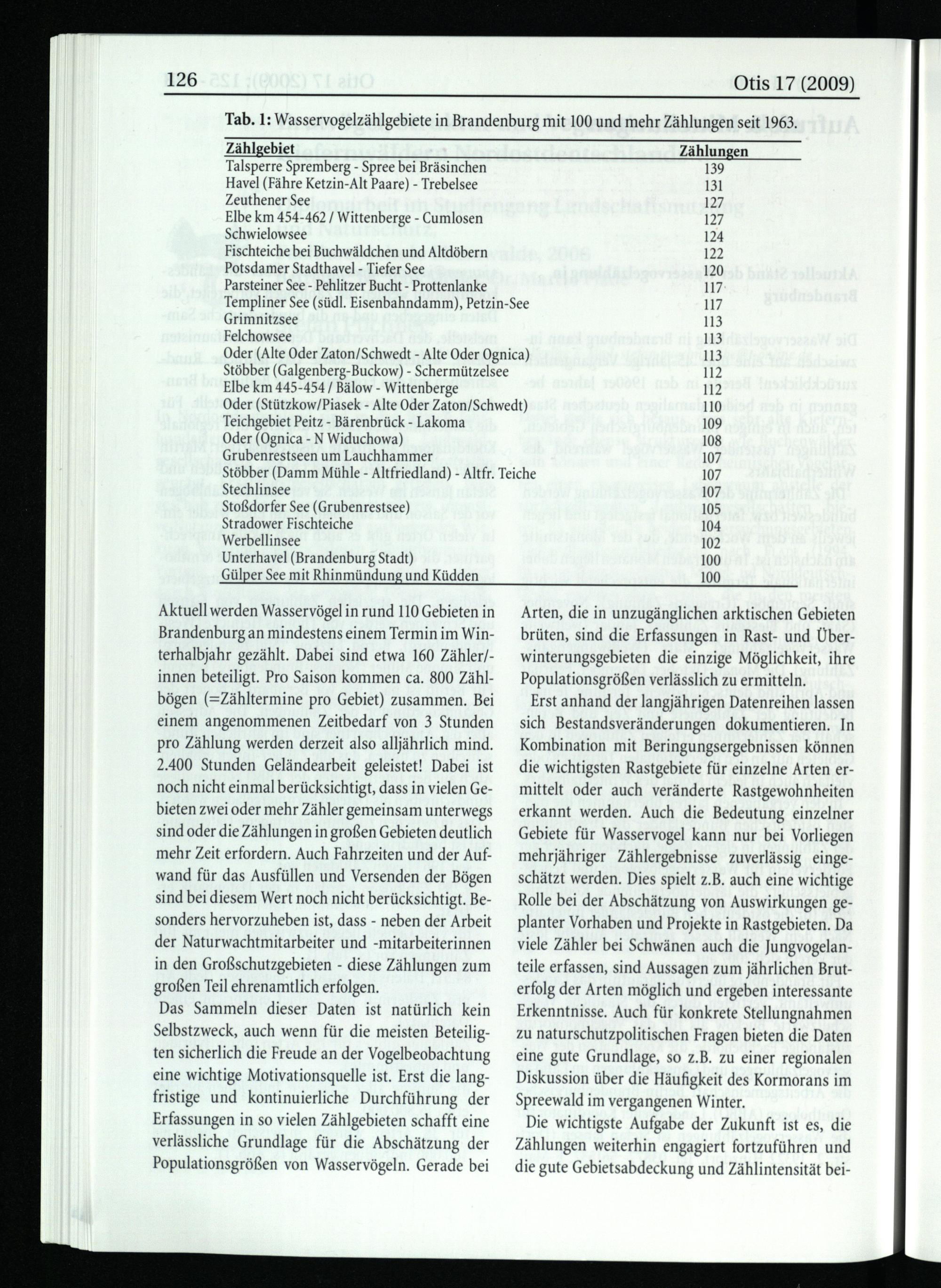 Aktuell werden Wasservögel in rund 110 Gebieten in Brandenburg an mindestens einem Termin im Winterhalbjahr gezählt. Dabei sind etwa 160 Zähler/innen beteiligt. Pro Saison kommen ca. 800 Zählbögen(=Zähltermine pro Gebiet) zusammen. Bei einem angenommenen Zeitbedarf von 3 Stunden pro Zählung werden derzeit also alljährlich mind. 2.400 Stunden Geländearbeit geleistet! Dabei ist noch nicht einmal berücksichtigt, dass in vielen Gebieten zwei oder mehr Zähler gemeinsam unterwegs sind oder die Zählungen in großen Gebieten deutlich mehr Zeit erfordern. Auch Fahrzeiten und der Aufwand für das Ausfüllen und Versenden der Bögen sind bei diesem Wert noch nicht berücksichtigt. Besonders hervorzuheben ist, dass- neben der Arbeit der Naturwachtmitarbeiter und-mitarbeiterinnen in den Großschutzgebieten- diese Zählungen zum großen Teil ehrenamtlich erfolgen.
