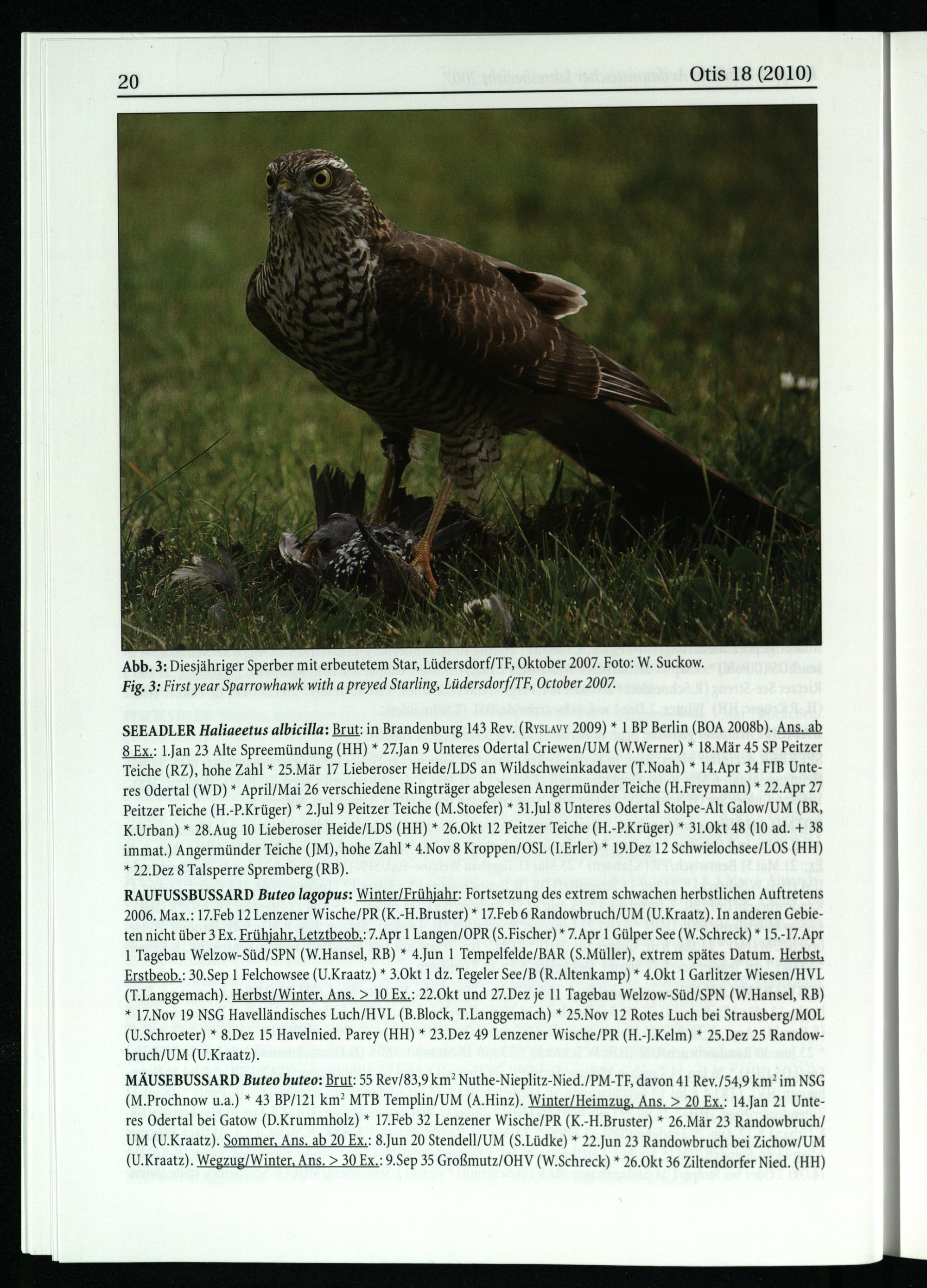 Abb. 3: Diesjähriger Sperber mit erbeutetem Star, Lüdersdorf/TF , Oktober 2007. Foto: W. Suckow. Fig. 3: First year Sparrowhawk with a preyed Starling, Lüdersdorf/TF, October 2007.