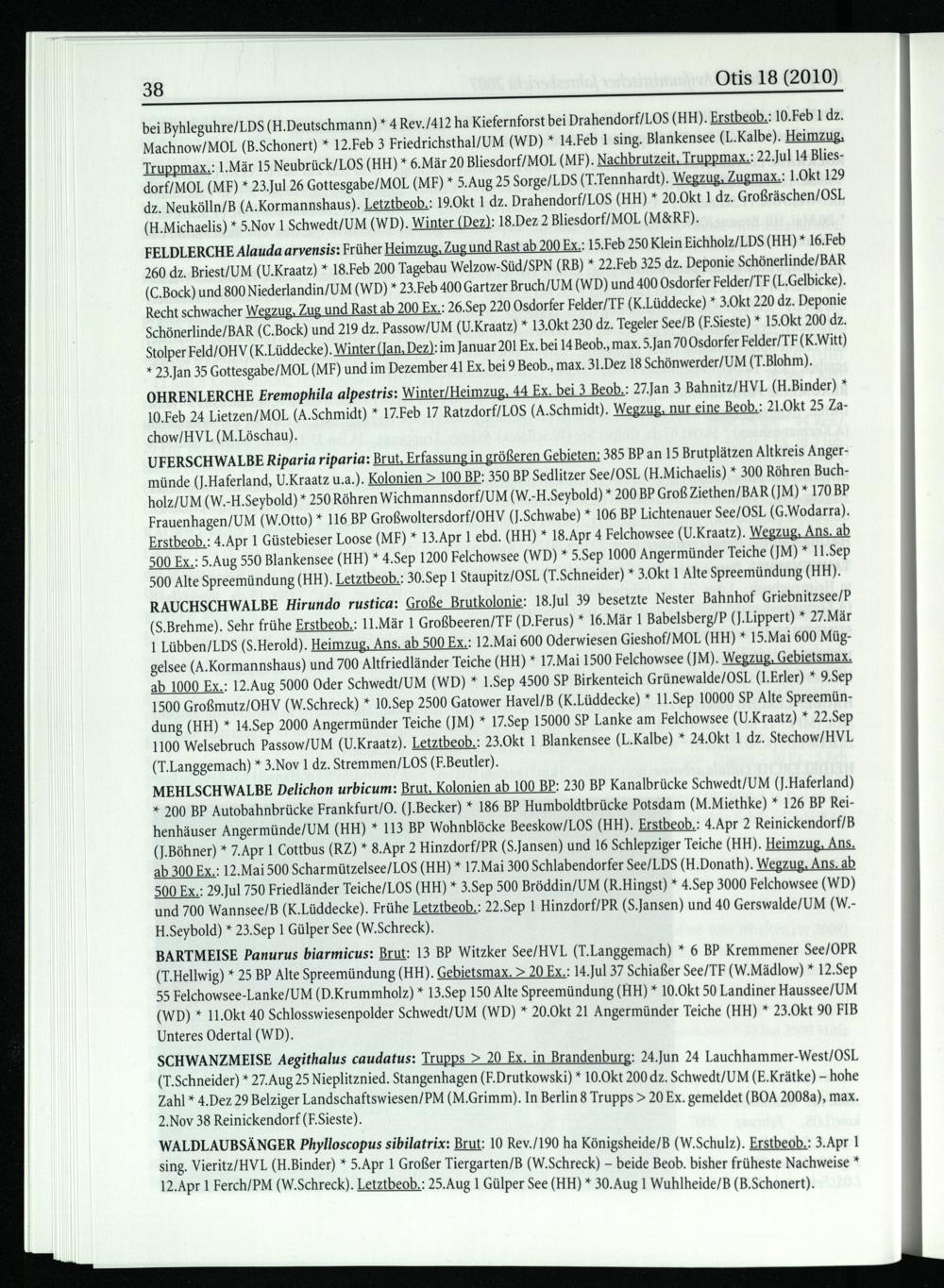 38 Otis 18(2010) bei Byhleguhre/LDS (H.Deutschmann)* 4 Rev./412 ha Kiefernforst bei Drahendorf/LOS(HH). Erstbeob.: 10.Feb 1 dz. Machnow/MOL(B.Schonert)* 12.Feb 3 Friedrichsthal/UM (WD)* 14.Feb 1 sing. Blankensee (L.Kalbe). Heimzug, Truppmax.: 1.Mär 15 Neubrück/LOS(HH)* 6.Mär 20 Bliesdorf/MOL (MF). Nachbrutzeit, Truppmax.: 22.Jul 14 Blies dorf/MOL (MP)* 23.Jul 26 Gottesgabe/MOL(MF)* 5.Aug 25 Sorge/LDS (T.Tennhardt). Wegzug, Zugmax.: 1.Okt 129 dz. Neukölln/B (A.Kormannshaus). Letztbeob.: 19.Okt 1 dz. Drahendorf/LOS(HH)* 20.Okt 1 dz. Großräschen/OSL (H.Michaelis)* 5.Nov 1 Schwedt/UM (WD). Winter(Dez): 18.Dez 2 Bliesdorf/MOL (M&RF).