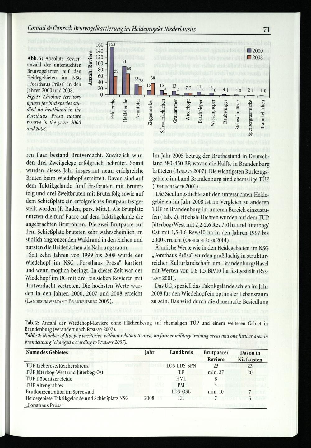 Die Siedlungsdichte auf den untersuchten Heidegebieten im Jahr 2008 ist im Vergleich zu anderen TÜP in Brandenburg im unteren Bereich einzustufen(Tab. 2). Höchste Dichten wurden auf dem TÜP Jüterbog/West mit 2,2-2,6 Rev./10 ha und Jüterbog / Ost mit 1,5-1,6 Rev./10 ha in den Jahren 1997 bis 2000 erreicht(OEHLSCHLÄGER 2001).