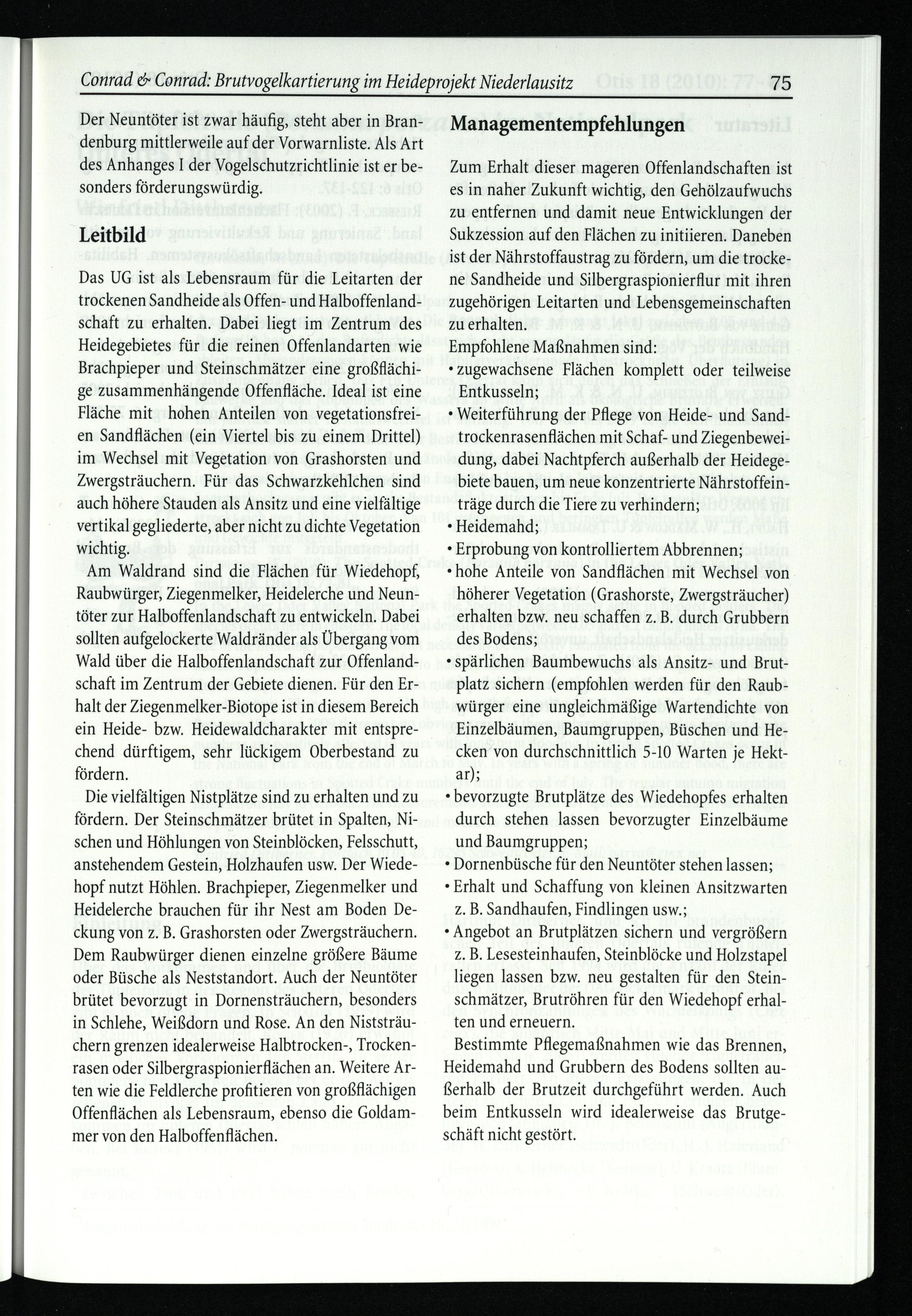 Das UG ist als Lebensraum für die Leitarten der trockenen Sandheide als Offen- und Halboffenlandschaft zu erhalten. Dabei liegt im Zentrum des Heidegebietes für die reinen Offenlandarten wie Brachpieper und Steinschmätzer eine großflächige zusammenhängende Offenfläche. Ideal ist eine Fläche mit hohen Anteilen von vegetationsfreien Sandflächen(ein Viertel bis zu einem Drittel) im Wechsel mit Vegetation von Grashorsten und Zwergsträuchern. Für das Schwarzkehlchen sind auch höhere Stauden als Ansitz und eine vielfältige vertikal gegliederte, aber nicht zu dichte Vegetation wichtig.
